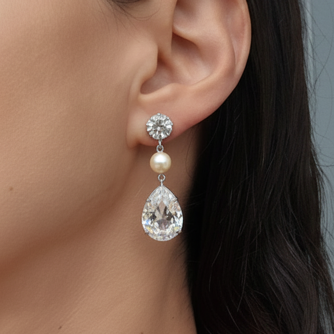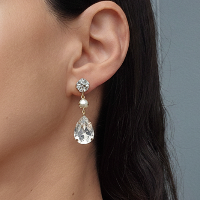 Elevate your elegance with the Adriana Earrings, a captivating blend of sophistication and timeless beauty featuring a stunning tear-drop crystal adorned with a lustrous round pearl and sparkling clear crystals, these earrings create a harmonious blend of shine, making them a standout accessory perfect for adding a chic touch to any outfit.