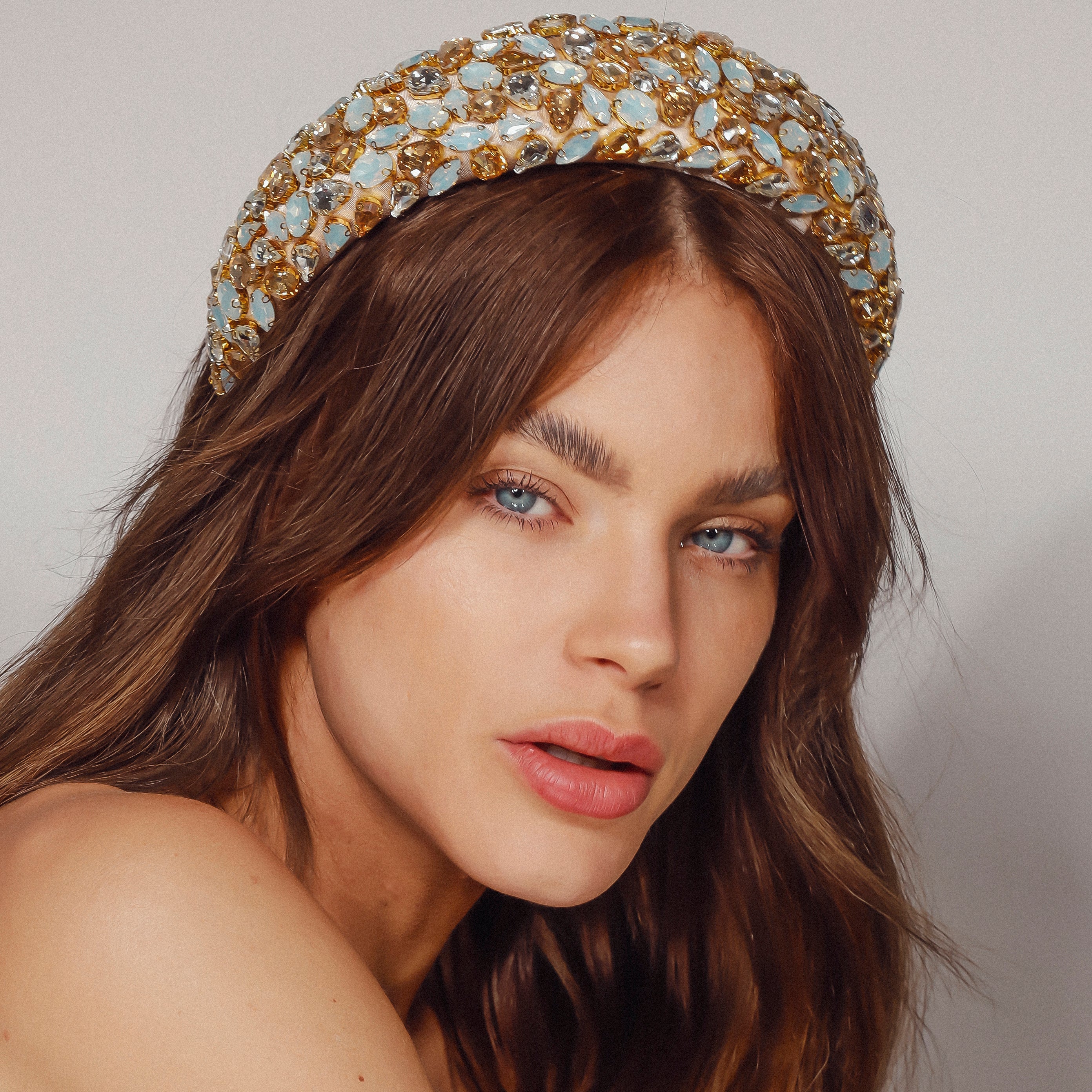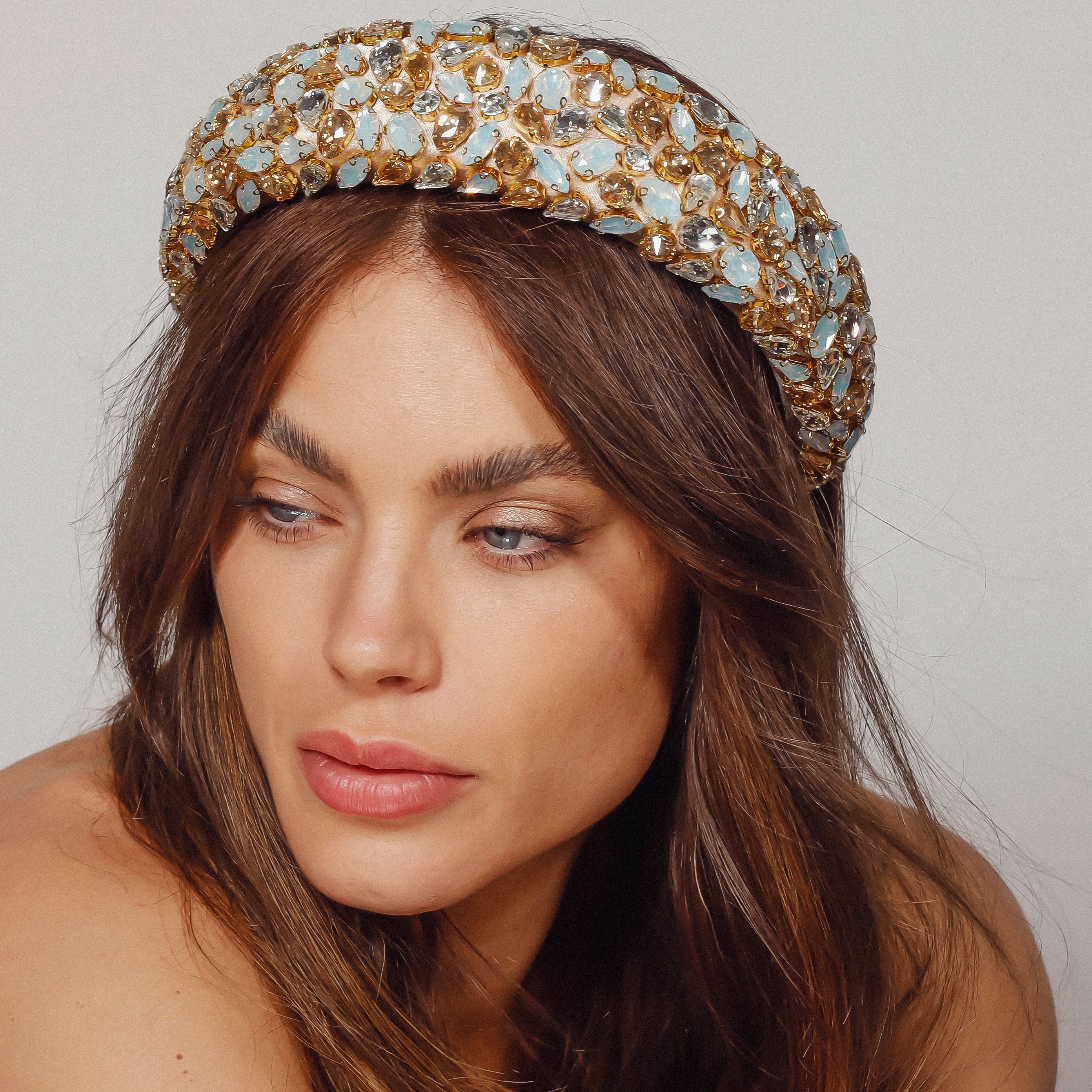 The Aqua Headpiece brings a touch of sparkling elegance for a beautiful and radiant look. The design features a sophisticated array of stones that shimmer beautifully, making it an ideal accessory for both modern and traditional occasions.