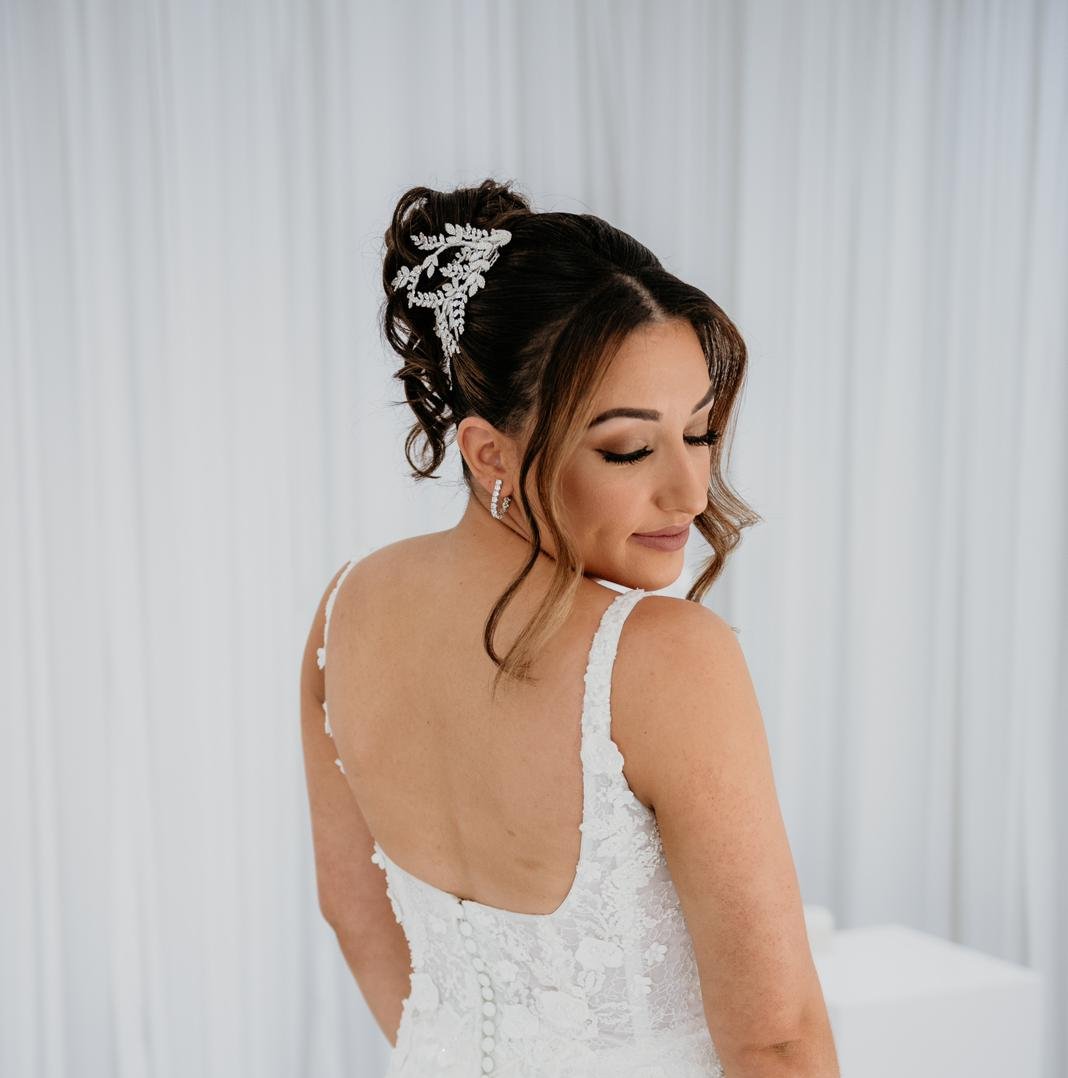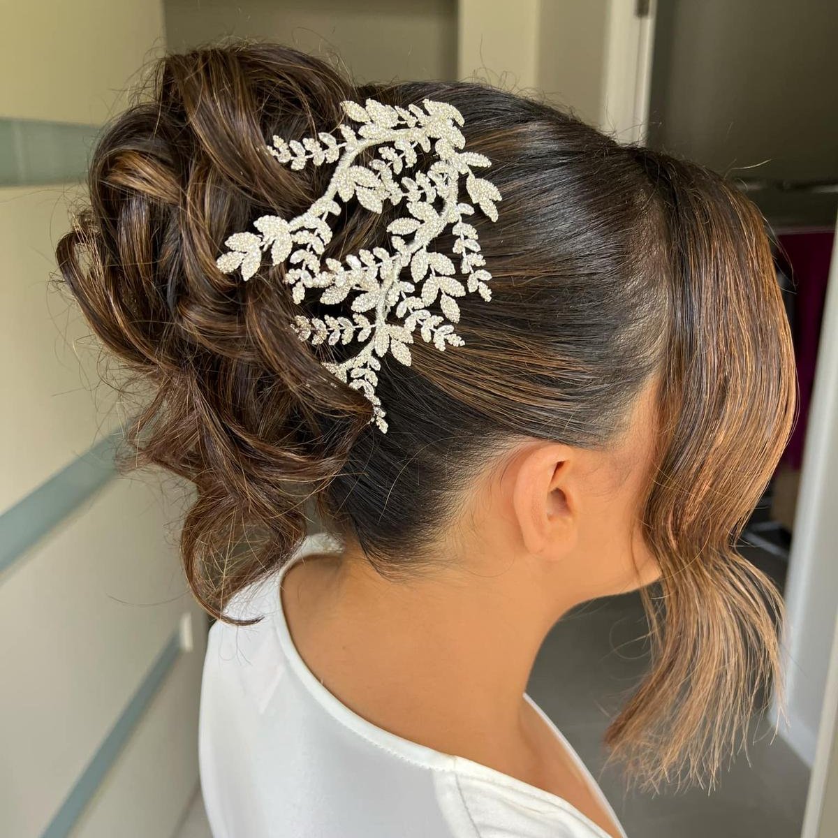 Elevate your hairstyle with the Bianca Side Piece, a stunning accessory designed to add a touch of regal glamour to your special day. The delicate, sparkling design of the leaves and branches will enhance any updo or bridal hairstyle, making you feel like royalty.