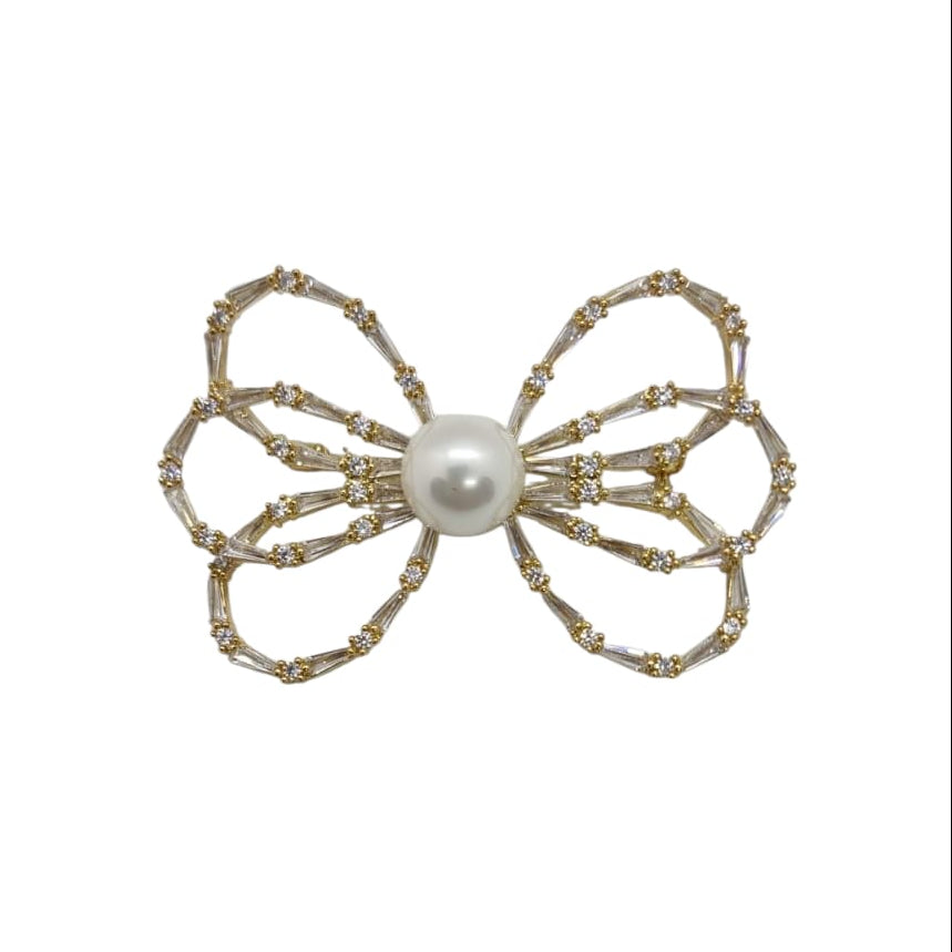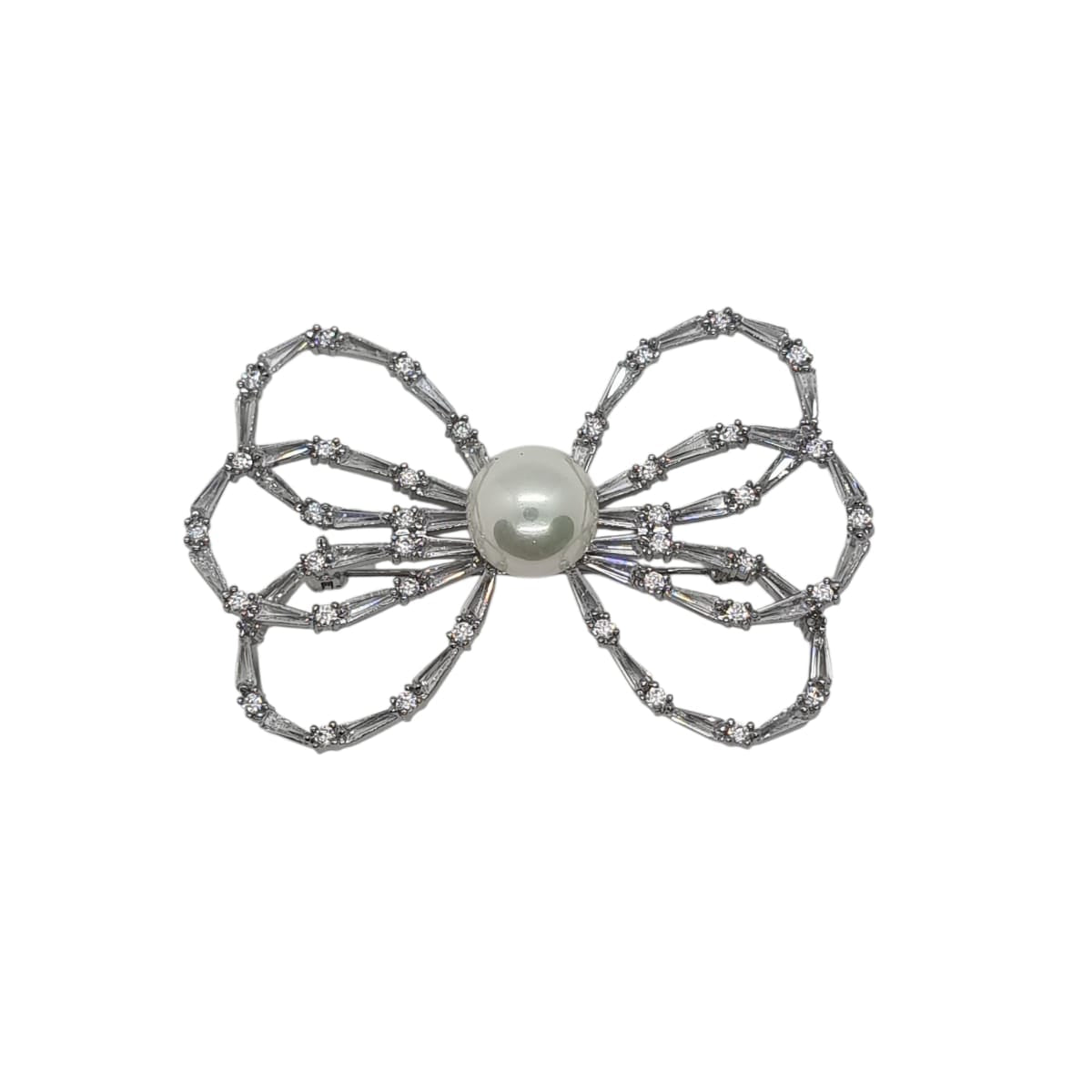 The Bowette Pin is a stunning and elegant accessory designed to bring a touch of sophistication and glamour to any look. Adorned with crystals and pearl, this pin features intricate detailing making it a perfect addition to your ensemble. Its timeless beauty adds a refined, luxurious feel, ideal for a statement piece to complement their attire.
