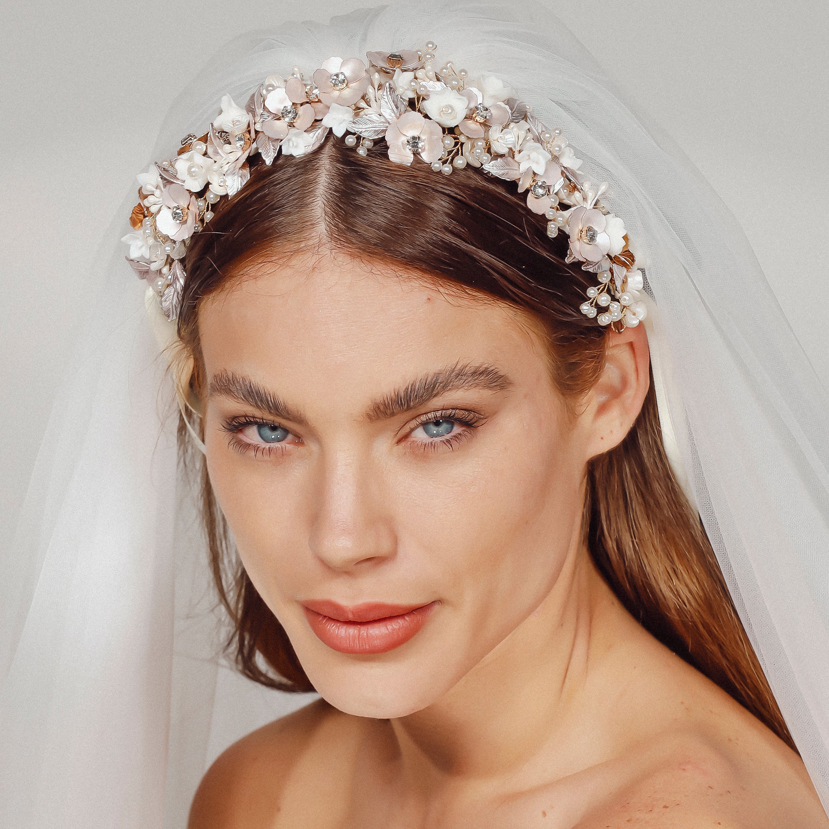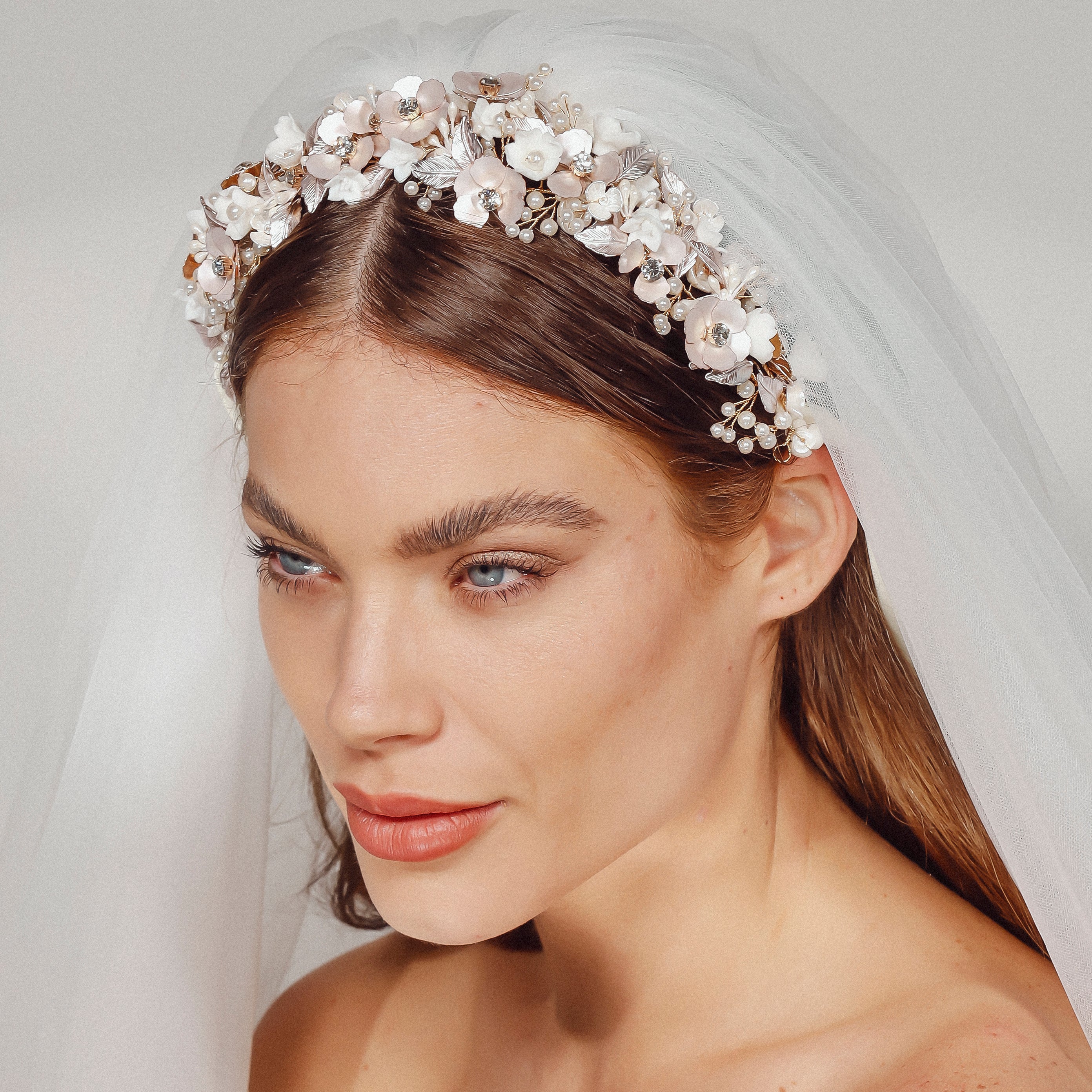 - Elegant Design: The headpiece features a stunning arrangement of flowers and pearls in either soft pink tones or silver tones creating a romantic and timeless look.