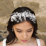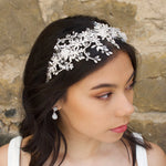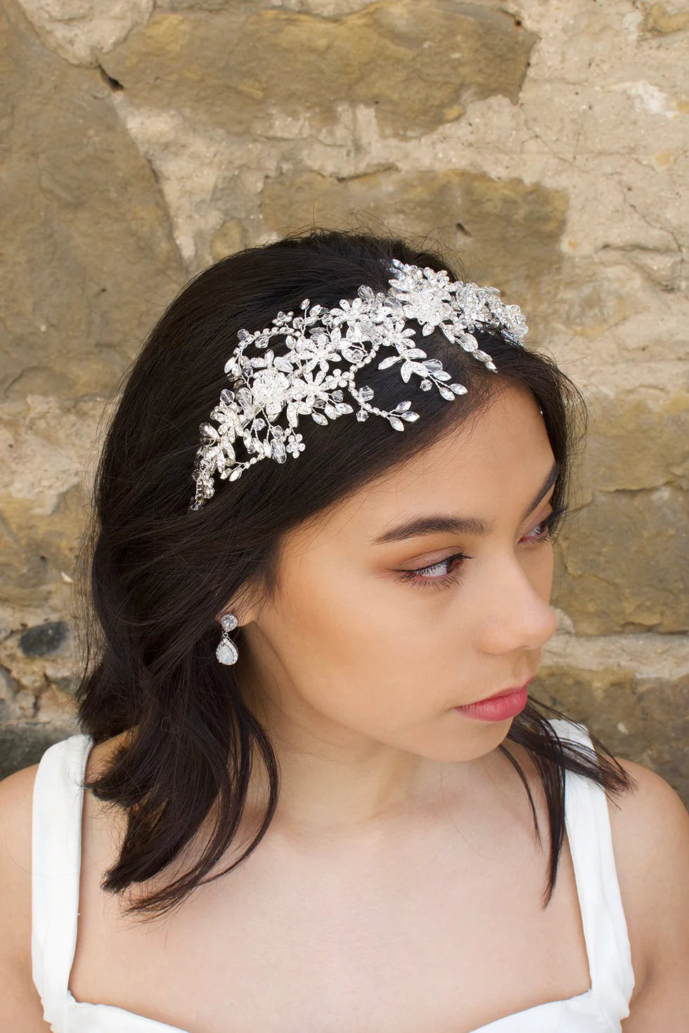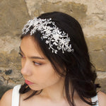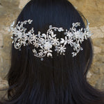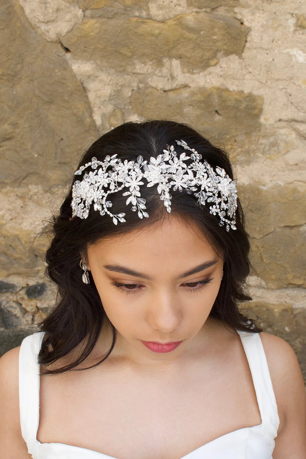 Our Caroline Headpiece is an elegant ensemble of clear stones and crystal encrusted leaves intertwined with silver flower details, creating a beautiful effect is the perfect way to complete your bridal look