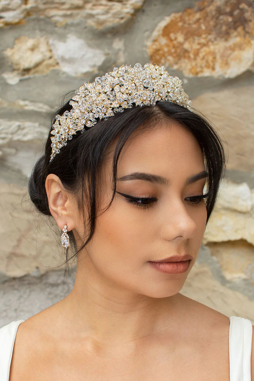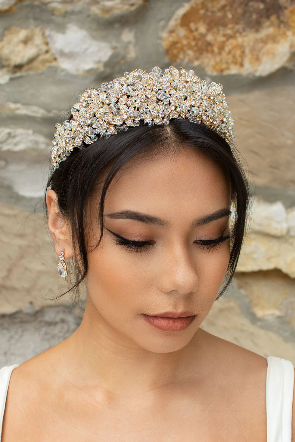 Our Charis Crown features a symphony of quality crystal, floral details and pale gold leaves. If you have been searching for a sophisticated statement headpiece with a touch of sparkle, you have found the one.