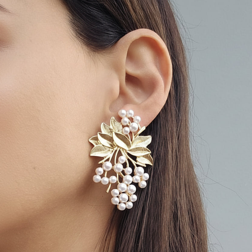 The Chello Earrings are a stunning statement piece that elegantly combines intricate design with a bold aesthetic. Featuring beautifully crafted leaves and set pearls, these earrings are perfect for adding a touch of glamour to any outfit.