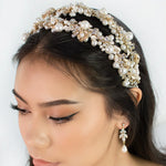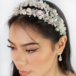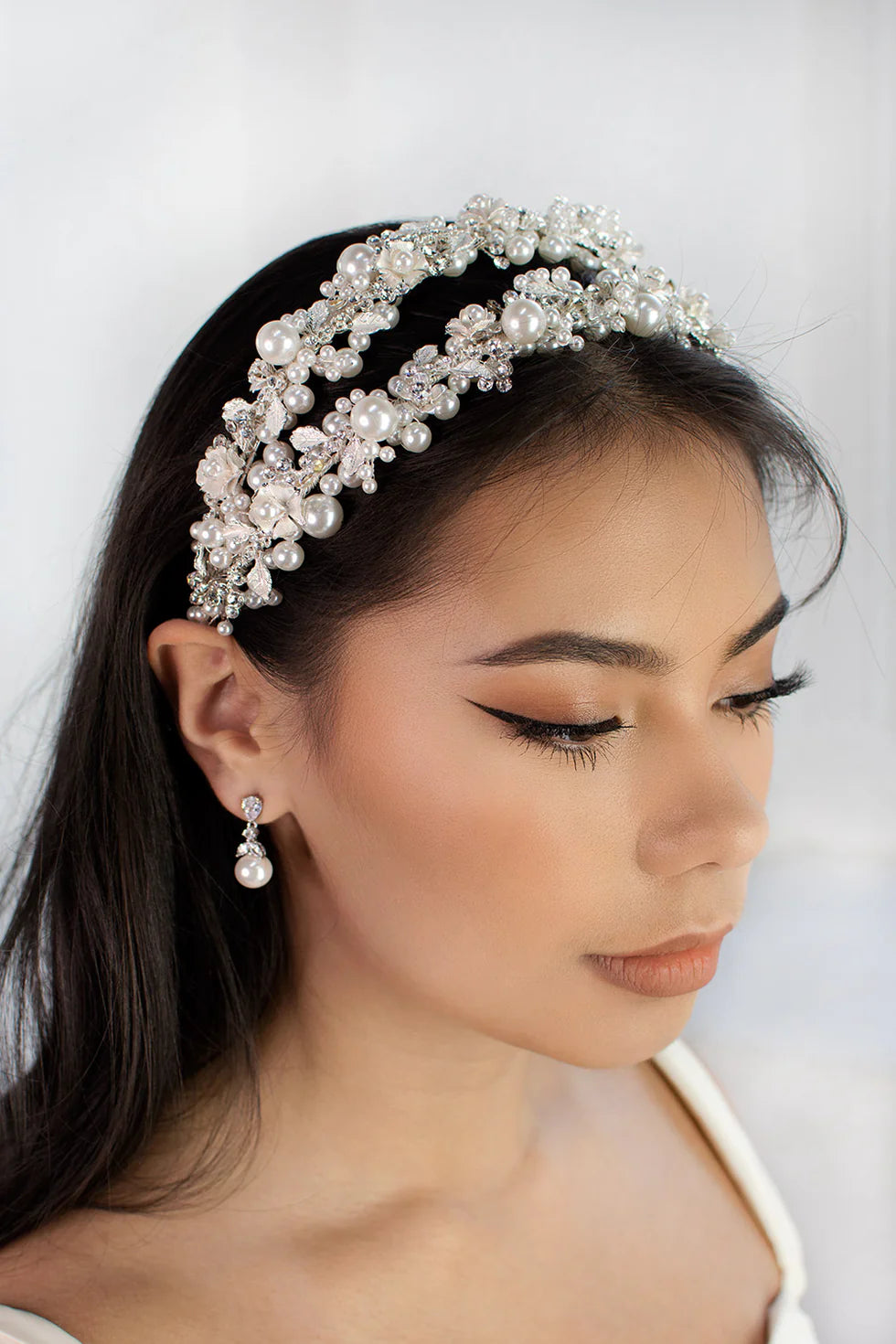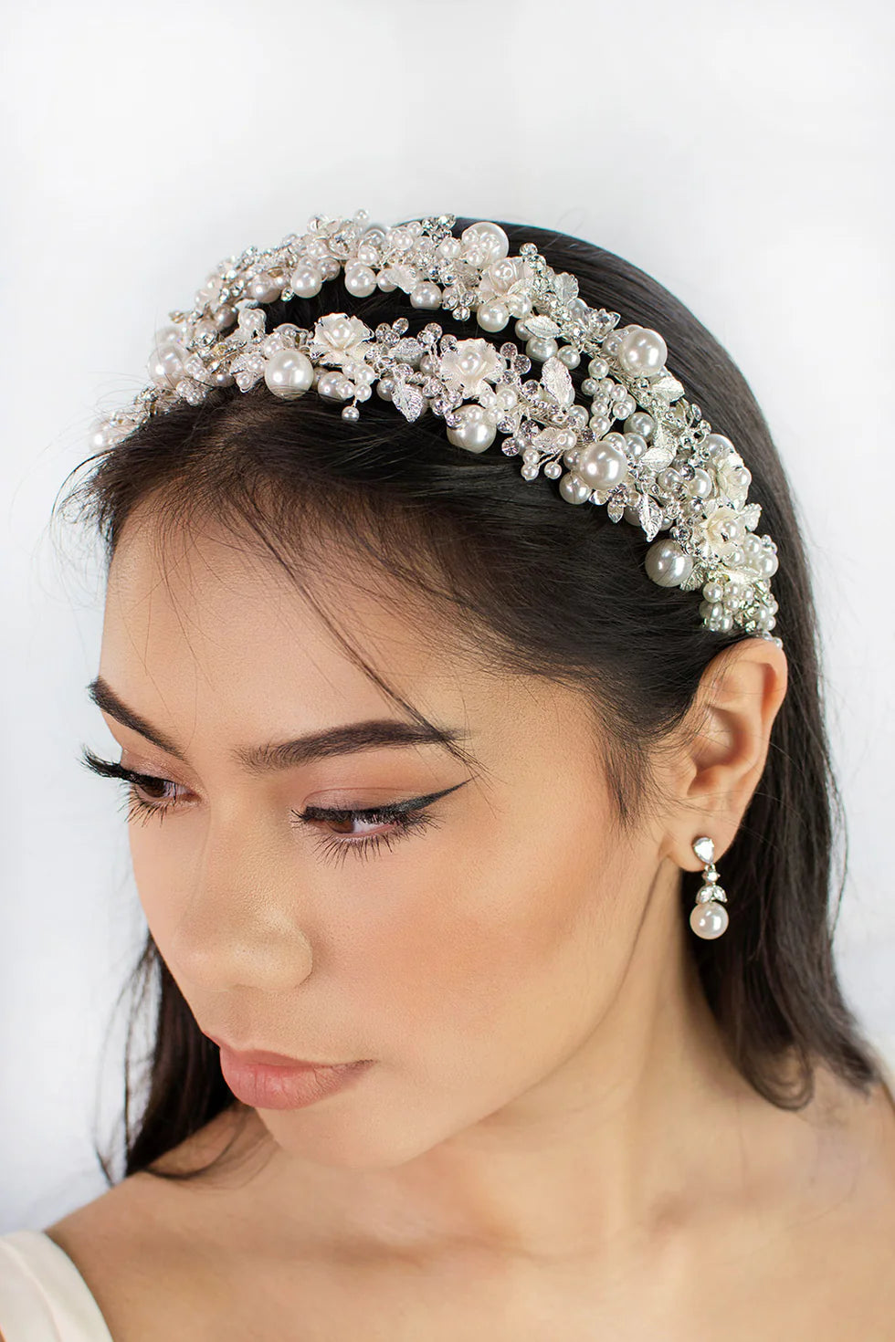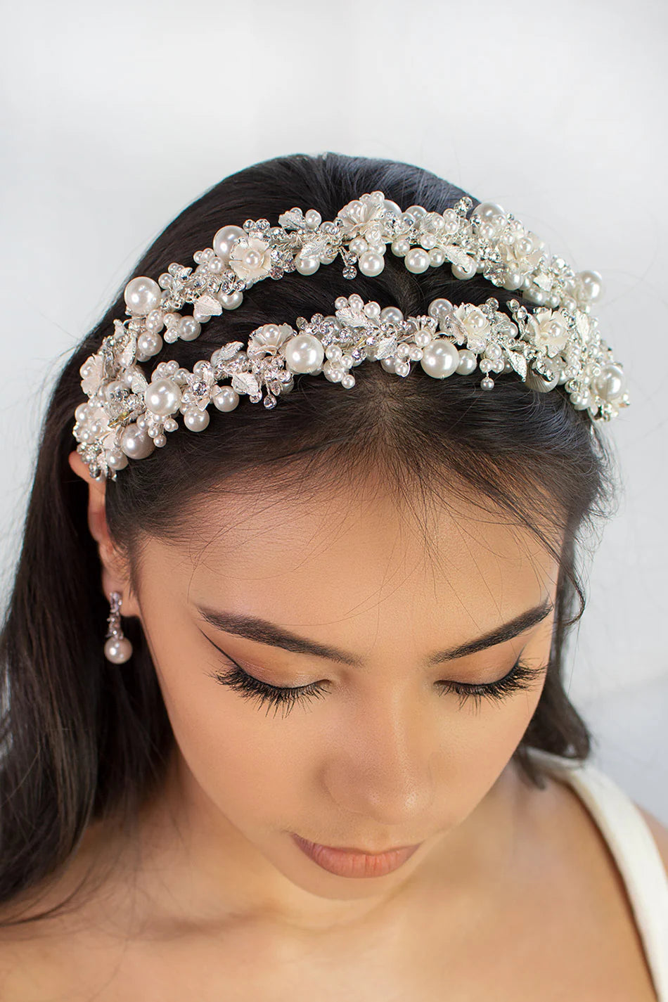 The Cinderella Double Headpiece is a charming twin garland of gleaming pearls and floral embellishments. Alongside small crystal and pearl sprigs, featuring clusters of pearls that range in size and variations of delicate metal flowers. Cinderella Double's metal frame is bendable, allowing the headband to be easily shaped to your head for comfort ideal for your special occasion.