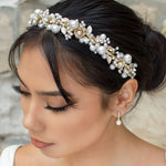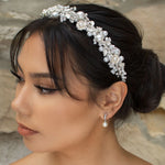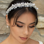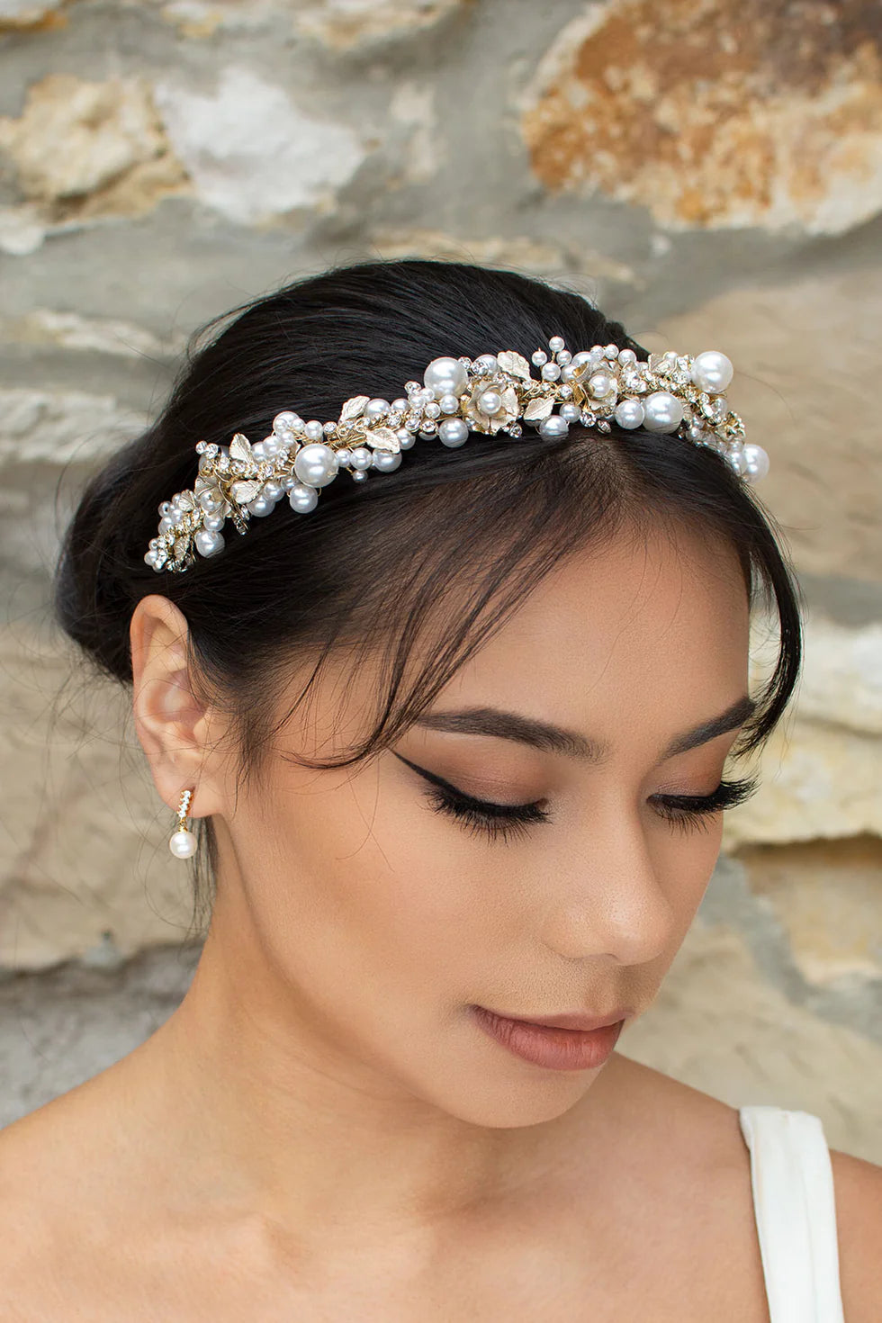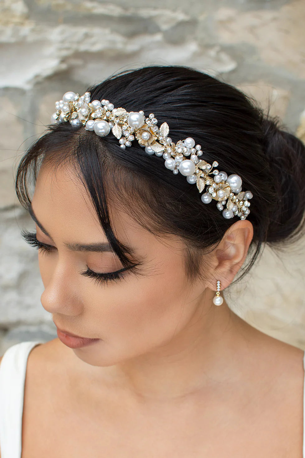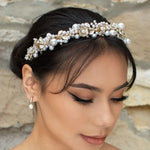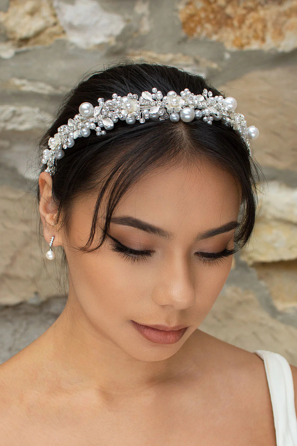 The Cinderella Single Headpiece is a charming garland of gleaming pearls and floral embellishments. Alongside small crystal and pearl sprigs, featuring clusters of pearls that range in size and variations of delicate metal flowers. Cinderella Single's metal frame is bendable, allowing the headband to be easily shaped to your head for comfort ideal for your special occasion.