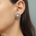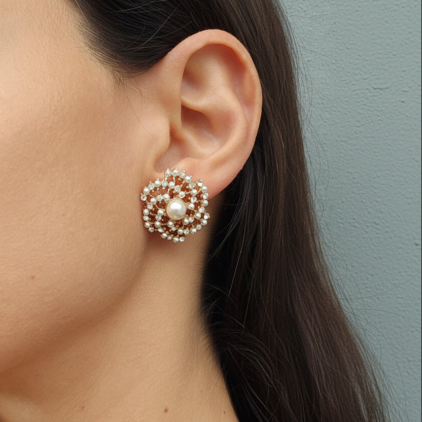 Elevate your elegance with our stunning Donna Earrings, featuring a captivating floral design of crystals and pearls, meticulously arranged to create a striking visual impact. These earrings cater to various style preferences and occasions.