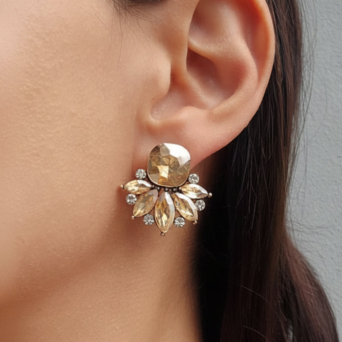 The Dumali Earrings are the epitome of sophistication, featuring a stunning design crafted from beautiful stones. The Dumali Earrings combine elegance with modern style, making them an ideal choice for weddings, evening events, or any special occasion. The intricately placed stones sparkle with every movement, catching the light and adding a touch of glamour to your ensemble.