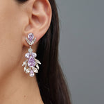 The Elle Earrings offer a dazzling and modern touch to any outfit, showcasing a stunning cascading design of lilac teardrop crystals, marquise and round shaped clear crystals reflecting elegance and grace. The dynamic arrangement of crystals creates a look that is both bold and refined, perfect for any occasion where you want to make a statement.