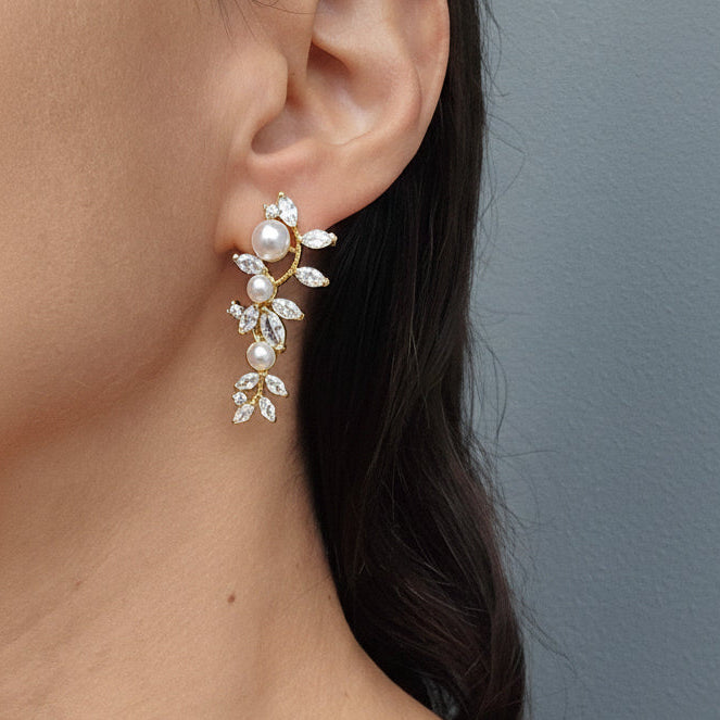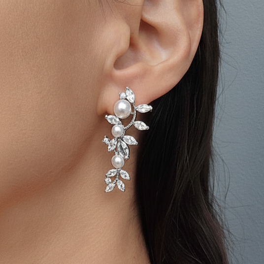 The Esmerelda Earrings are a statement of elegance, featuring sparkling marquise and round-shaped cubic zirconia stones with pearls that glimmer with every movement, these earrings are designed to elevate your ensemble with their glamorous and timeless appeal.