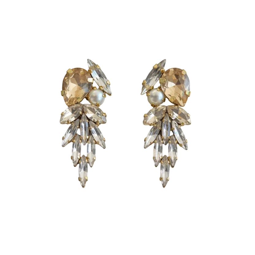 Introducing the Essana Earrings, a stunning accessory that combines elegance and sophistication, adorned with sparkling gemstones and pearl that catch the light beautifully, they are the perfect statement piece to elevate any outfit, whether for a glamorous evening out or a chic day look.