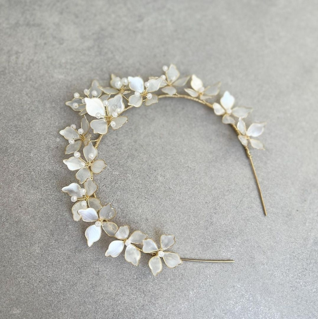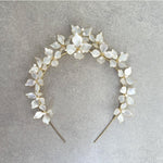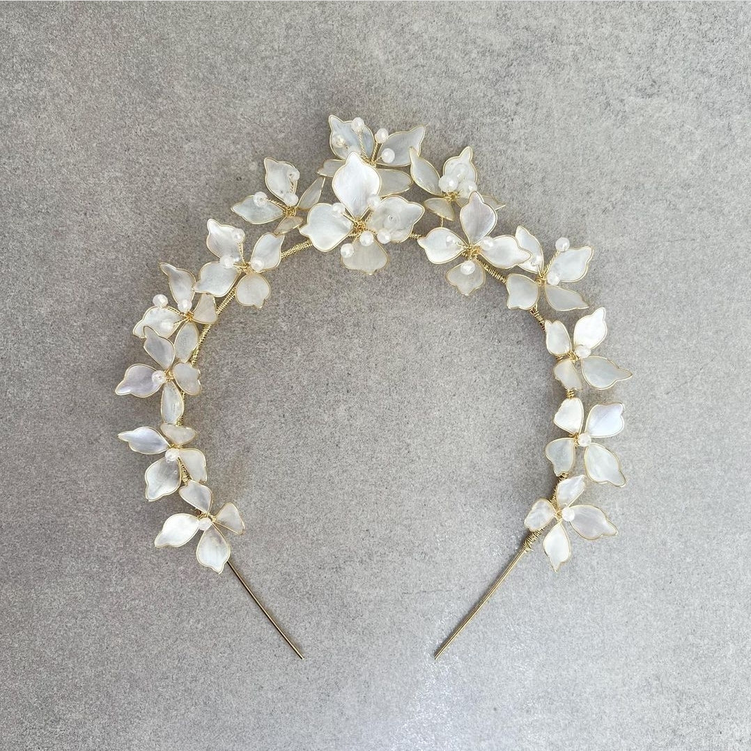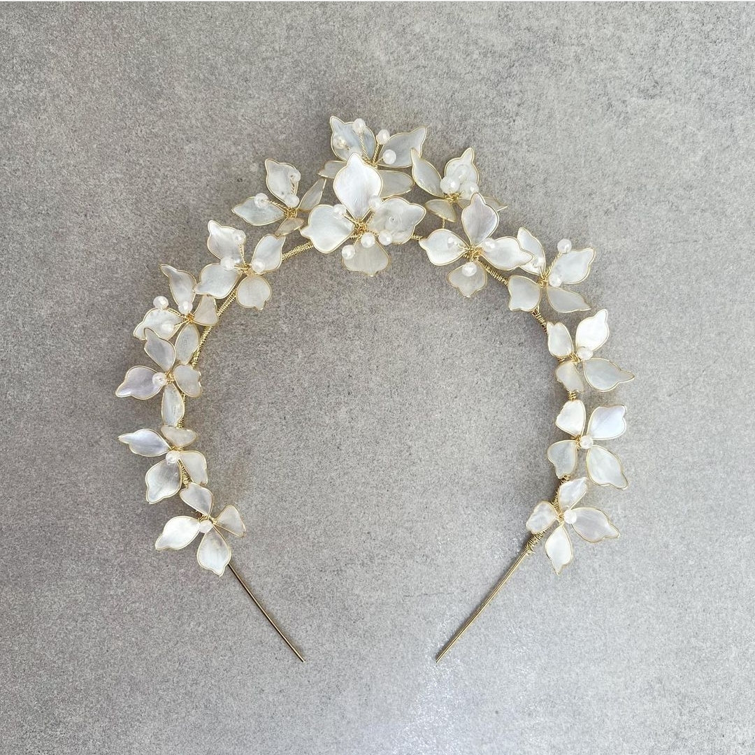 The Florina Headpiece is a delicate and enchanting accessory, perfect for brides or special occasions. Crafted with intricate floral motifs and shimmering pearls, this crown adds a touch of elegance and whimsy to any look.