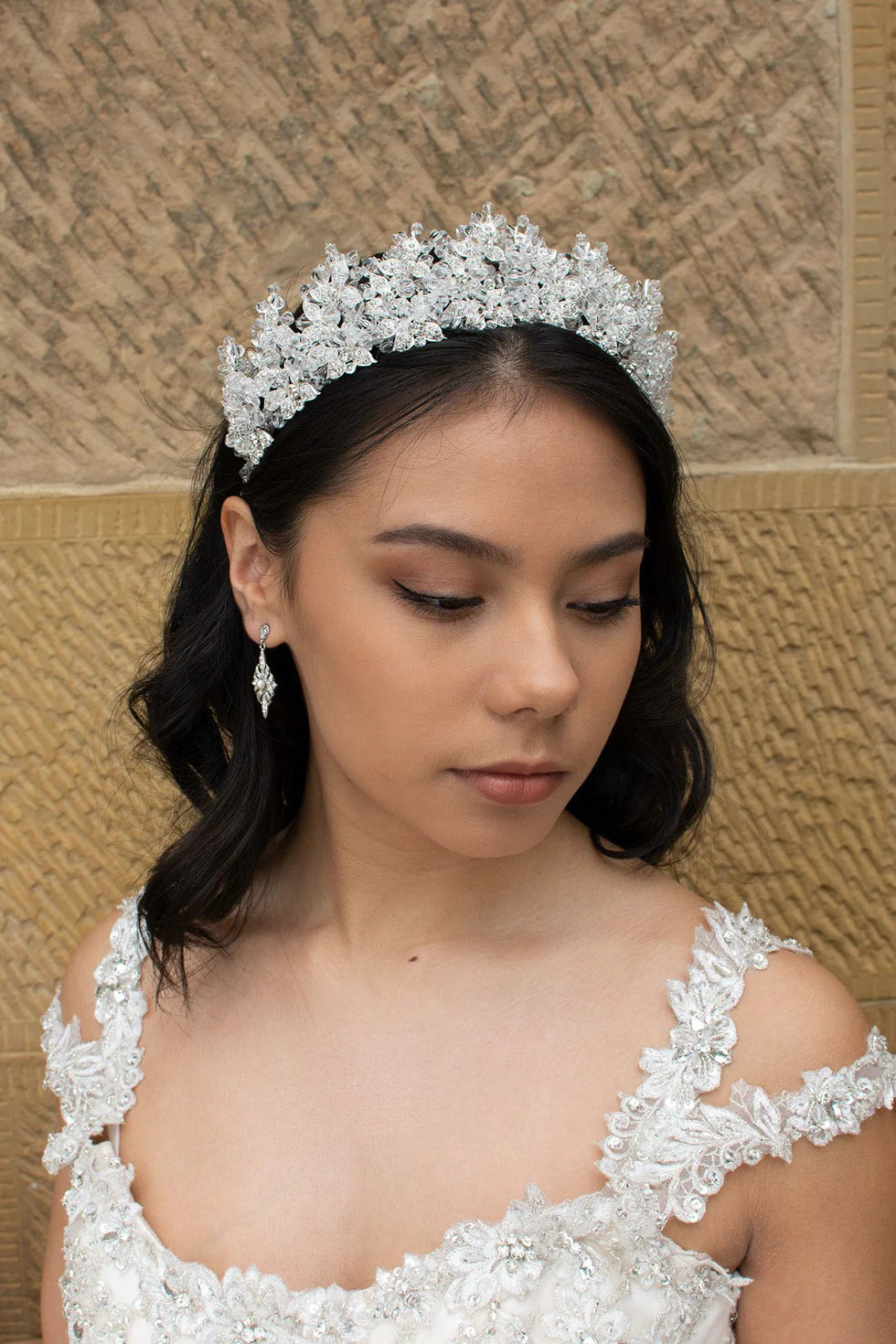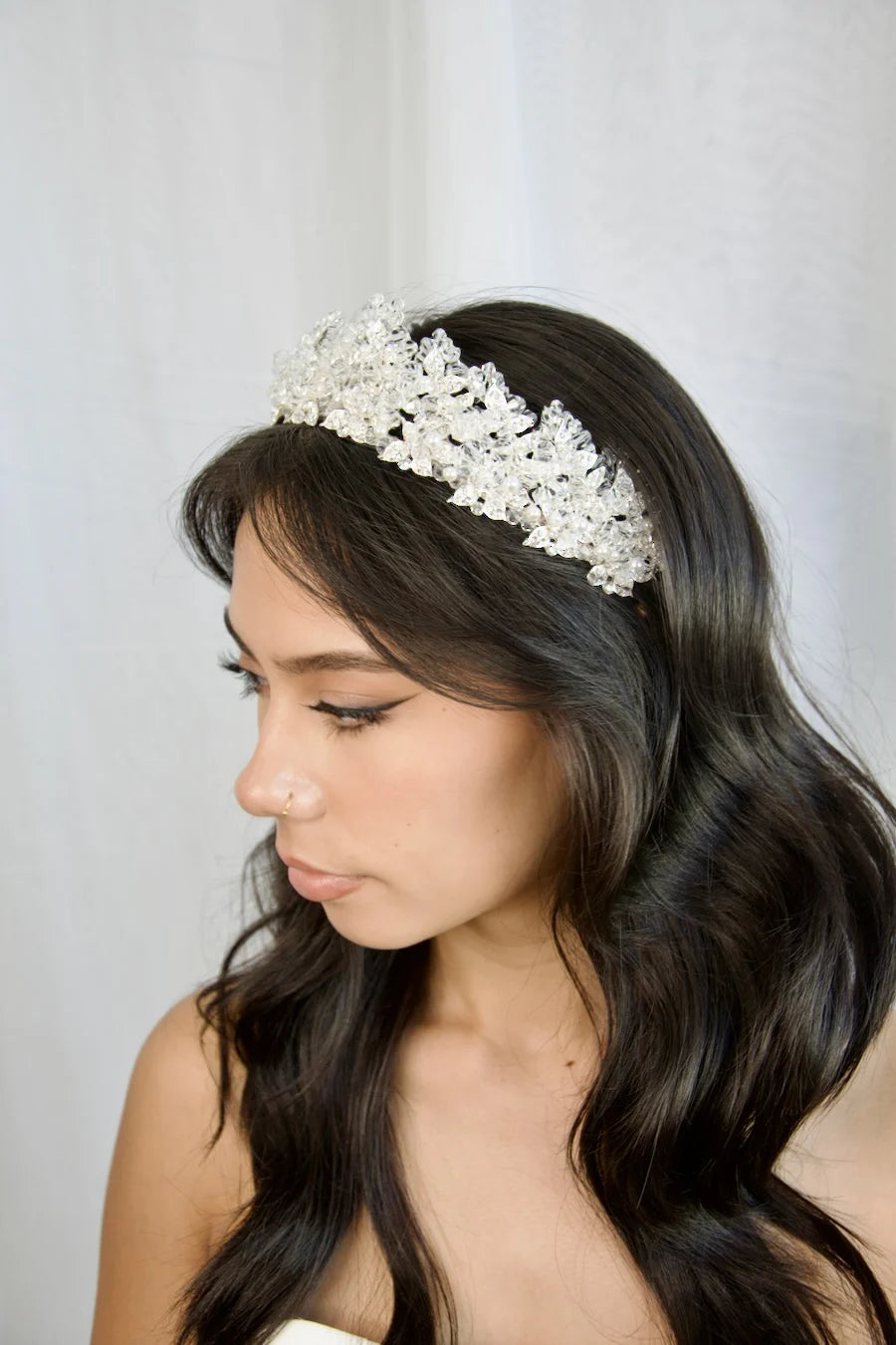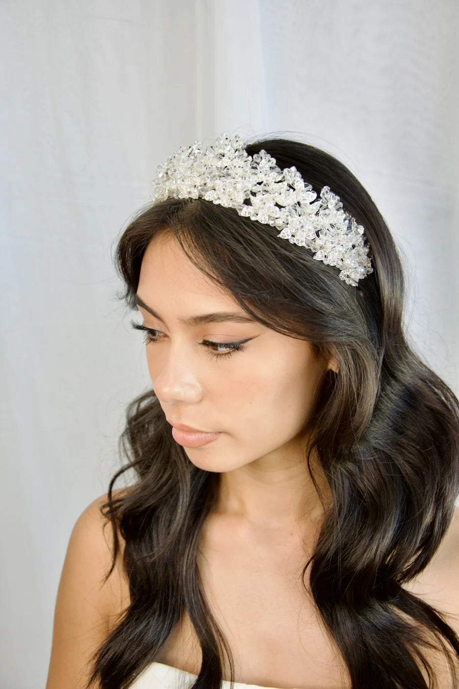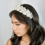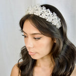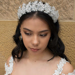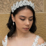 Our Frances Crown is a uniquely brilliant ensemble of bright crystal beads and encrusted silver leaves, a high standing crown, Frances's crystallized peaks exude crystal clear charm and elegance. If you have been searching for a sophisticated statement crown with a touch of sparkle, you have found the one.