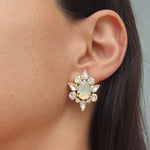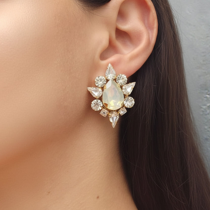 The Gimula Earrings offer a dazzling and modern touch to any outfit, showcasing a stunning design of clear and opal crystals, reflecting elegance and grace. The dynamic arrangement of crystals creates a look that is both bold and refined, perfect for any occasion where you want to make a statement.