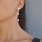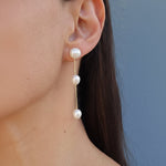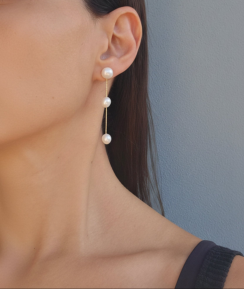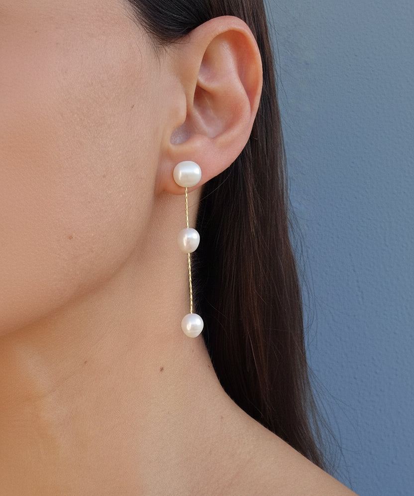 The Karmela Mini Earring is an elegant and timeless accessory that brings sophistication and grace to any occasion. Adorned with three freshwater pearl beads, this piece radiates understated beauty. The long, delicate design with the pearls spaced along the chain creates a refined and stylish look, making it the perfect addition to both casual and formal attire. With its lightweight construction and elegant finish, the Karmela Mini Earring is sure to complement any ensemble beautifully.