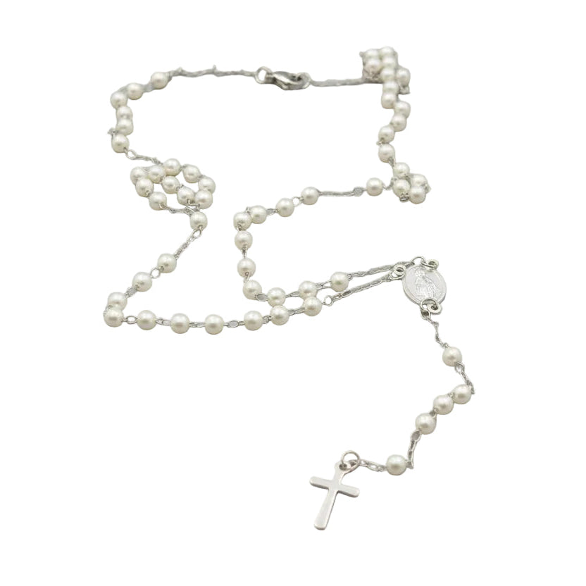 The Kiara Necklace is an elegant design featuring 4mm pearl beads and detailed stainless steel Mother Mary pendant and cross, this piece serves as both a spiritual and a sophisticated accessory. Perfect for both daily use and special occasions.