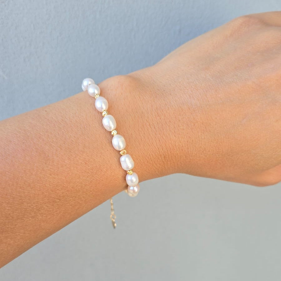 The Kornova Bracelet is a sophisticated piece that beautifully displays the timeless elegance of freshwater pearls. This bracelet is designed to add a luxurious touch to any outfit, whether for a special occasion or an everyday accessory.