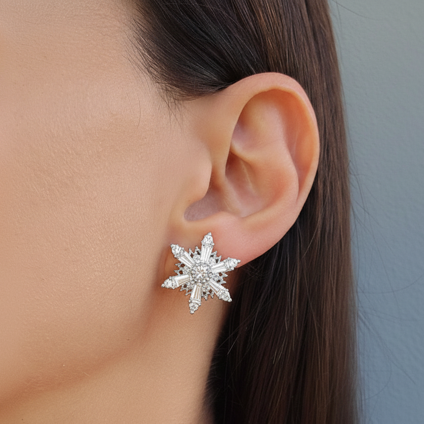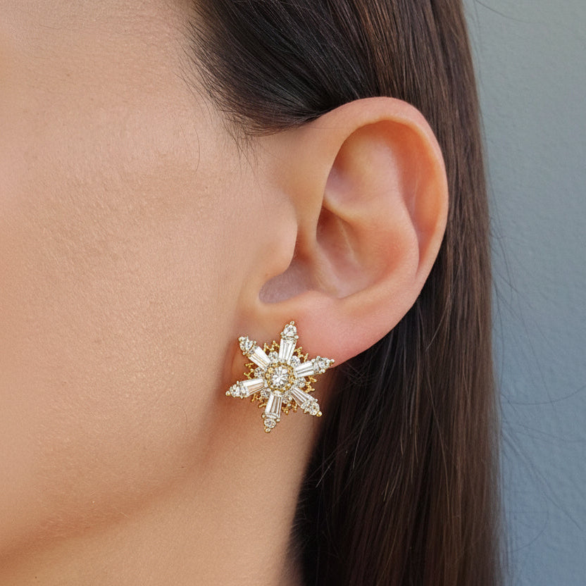 Elevate your look with the Liana Earrings, a stunning and elegant addition to any jewellery collection. Adorned with a radiant gold and rhodium plated finish, this design features a captivating cluster of cubic zirconia stones arranged in an intricate, eye-catching snowflake motif. The Liana Earrings add a sophisticated and charming flair to your look, wether it's for a special event or an every day chic outfit.