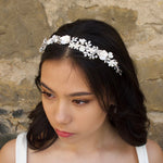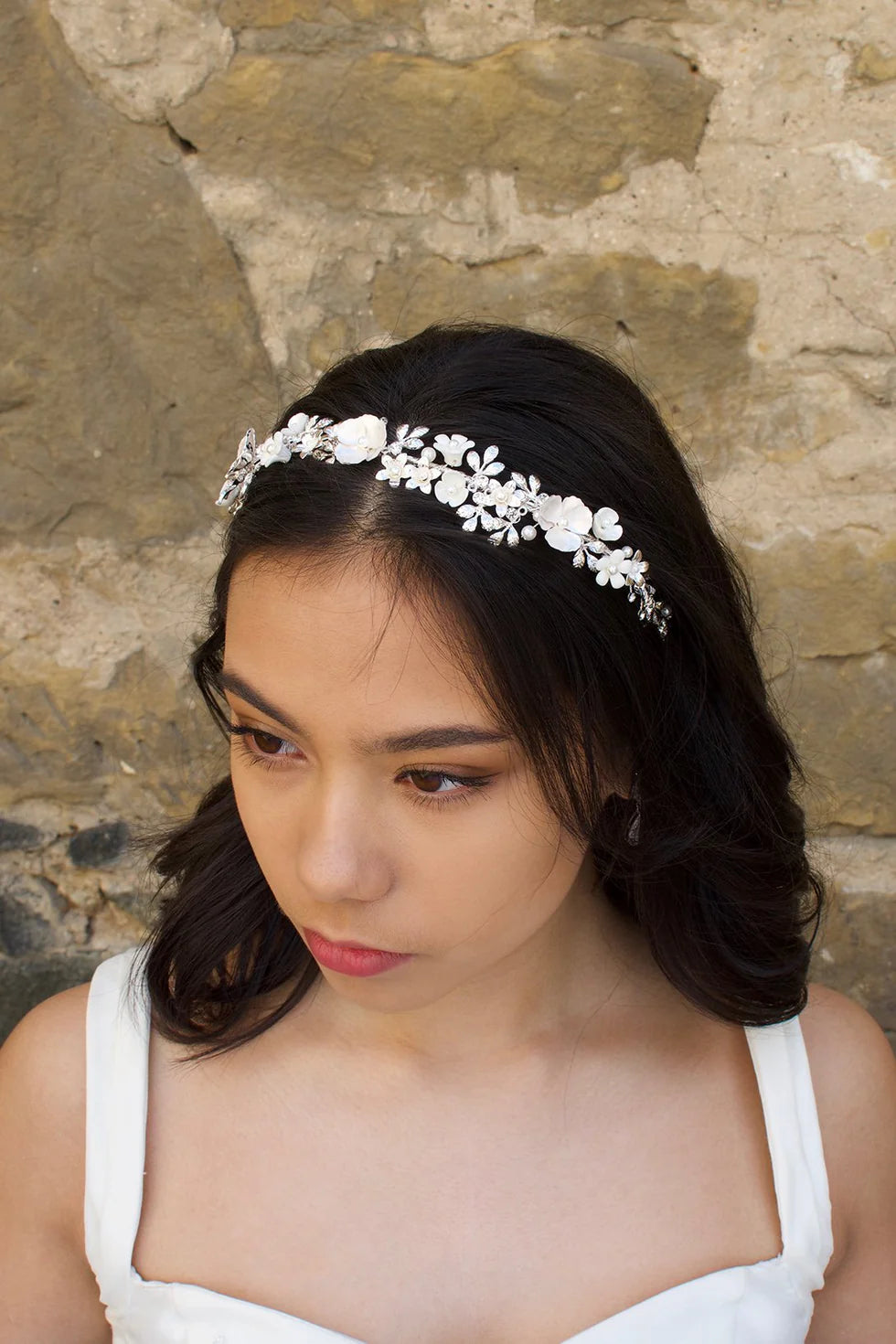 The Limali Headband of delicate flowers with soft silver leaves is the perfect simple headband for any occasion. The varying flower components mimic the look of real fresh flowers, glistening in the light with a soft white-pearlescent finish.