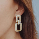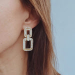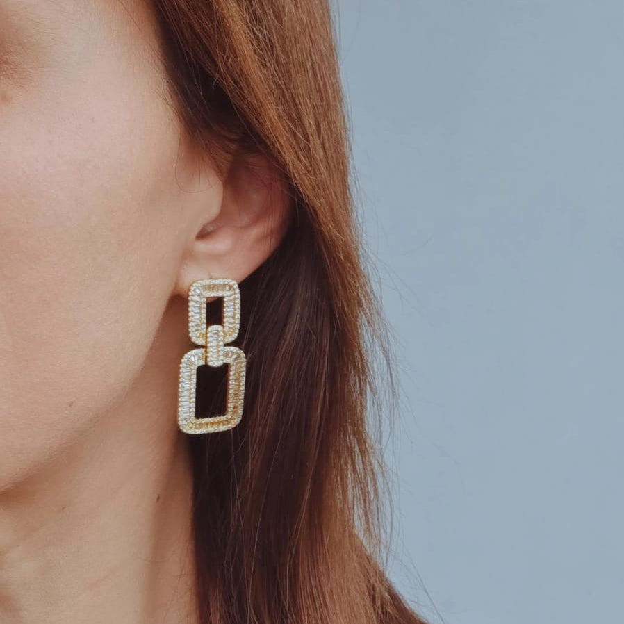 The Linkden Earrings feature two rectangular halos adorned with clear stones. The shiny halo of stones around them adds a luxurious touch, making these earrings perfect for elevating any outfit. Whether you’re attending a formal event or a casual outing.