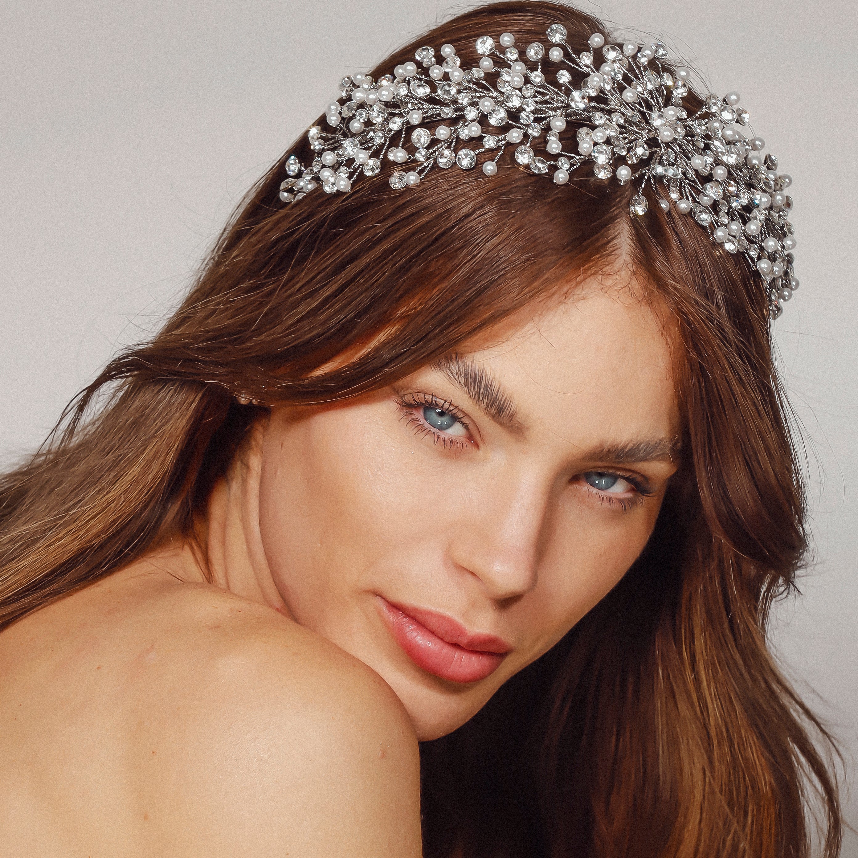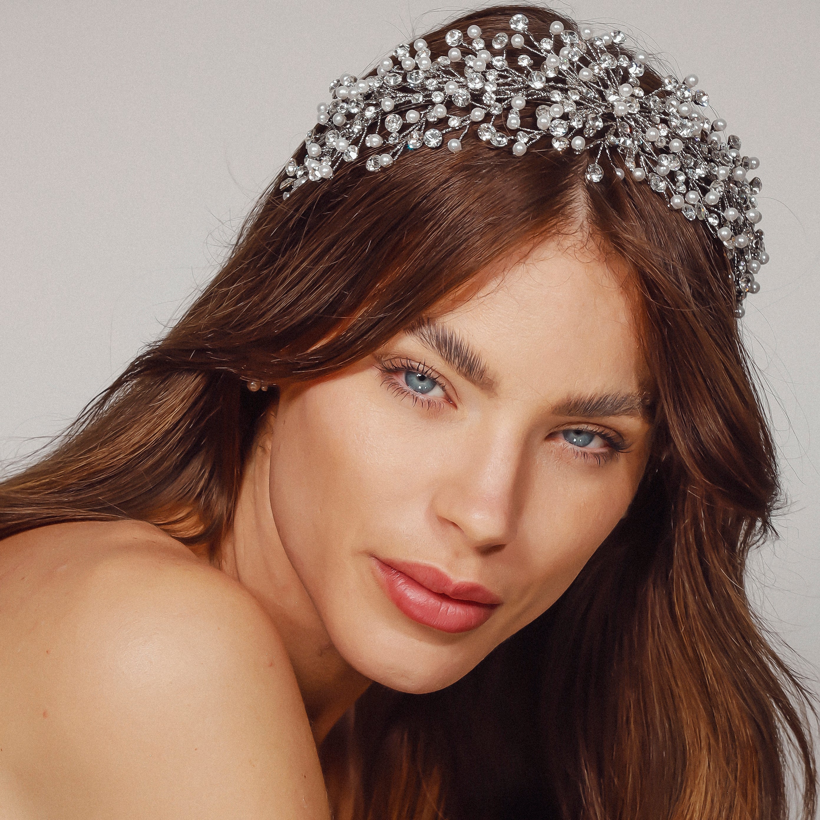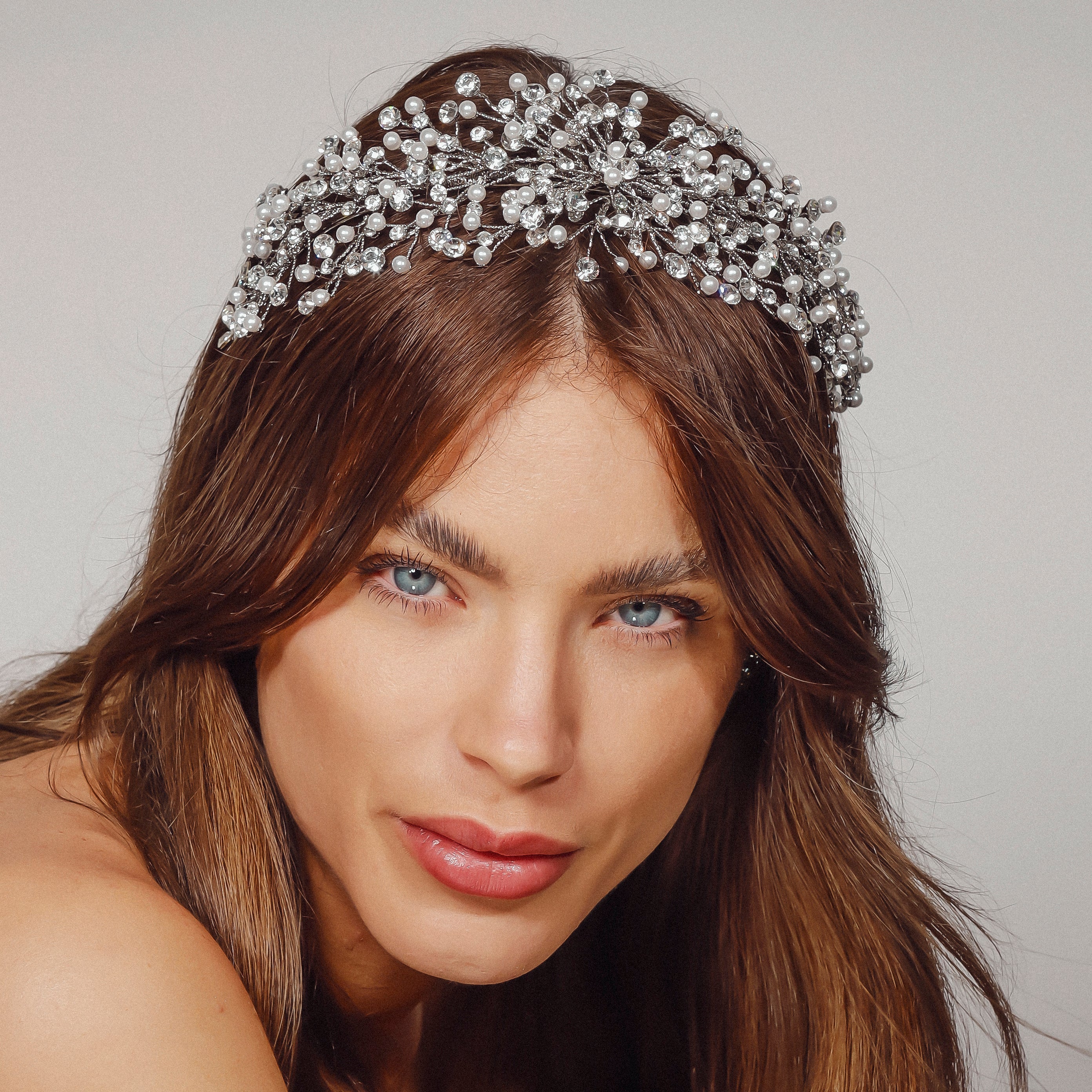 The Lucerne Headpiece is a stunning creation crafted from Rhodium, Gold, Rose Gold, or Silver plating, adorned with AAA grade cubic zirconia and luminous pearls. Its intricate design reflects sophistication and elegance, making it the perfect accessory for weddings, formal occasions, or adding a touch of luxury to your special day.