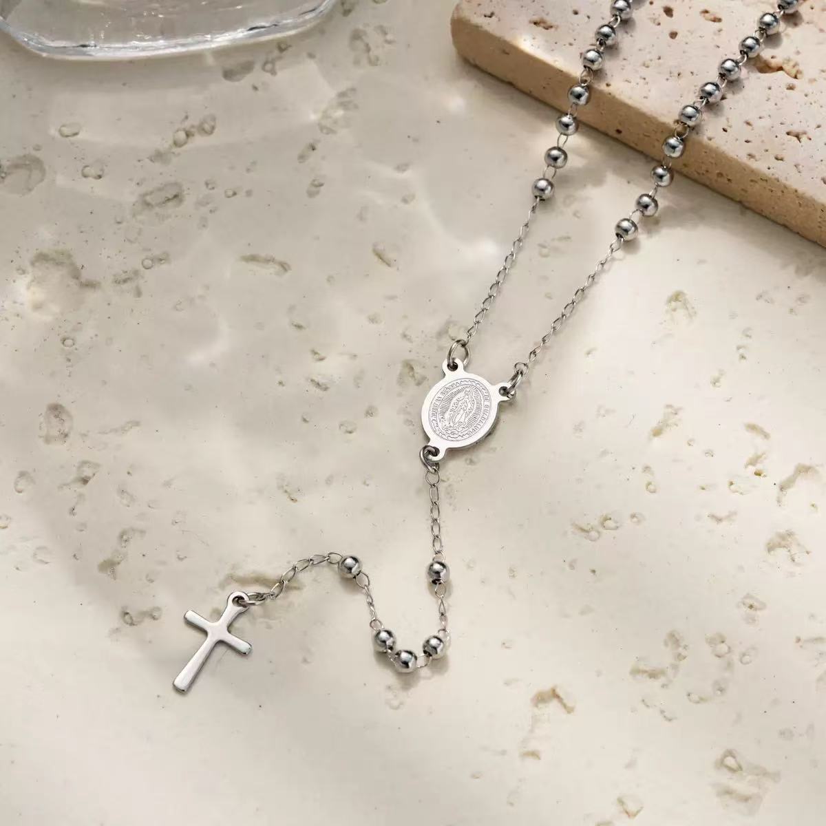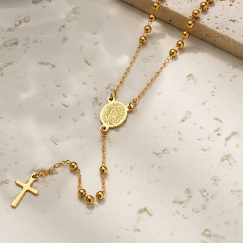 The Mariam Rosary is an elegant design, featuring 2mm beads and a detailed stainless steel religious Mother Mary connector and cross, this piece serves as both a spiritual and a sophisticated accessory. Perfect for both daily use and special occasions.