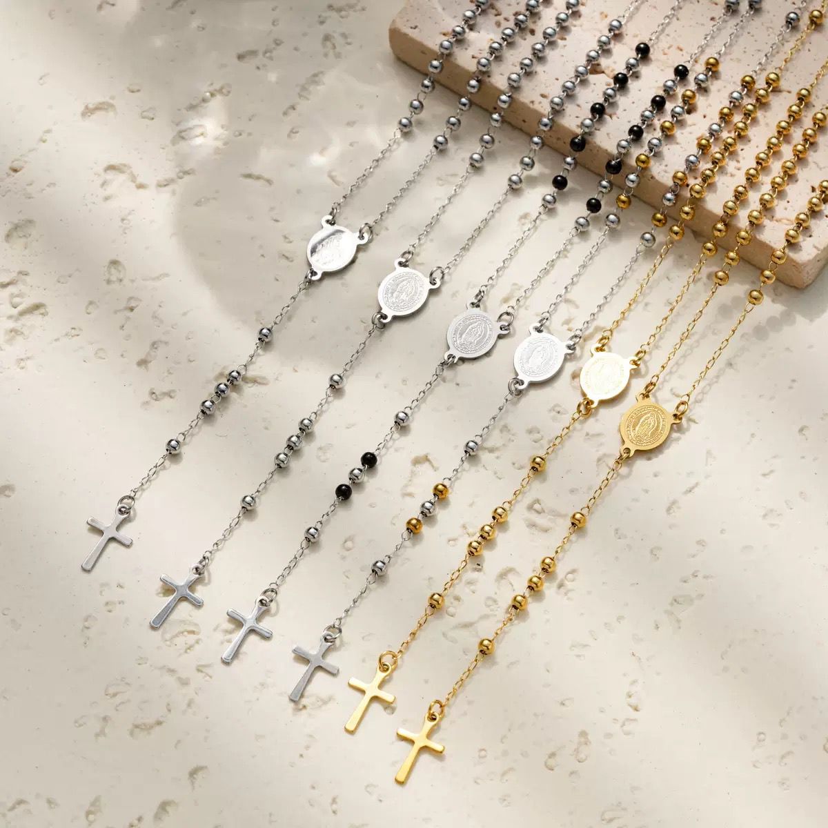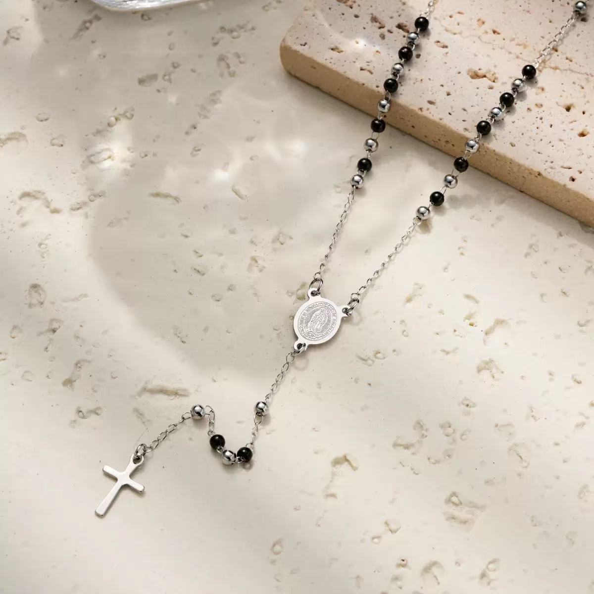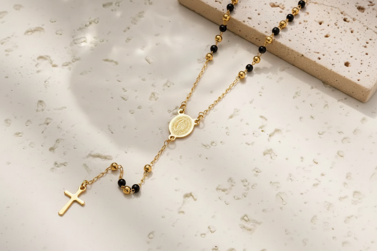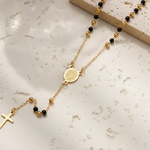 The Mariam Mix Rosary is an elegant design, featuring 2mm beads and a detailed stainless steel religious Mother Mary connector and cross, this piece serves as both a spiritual and a sophisticated accessory. Perfect for both daily use and special occasions.