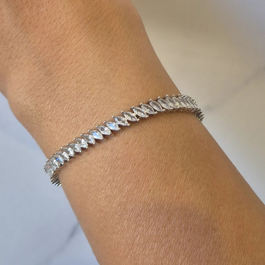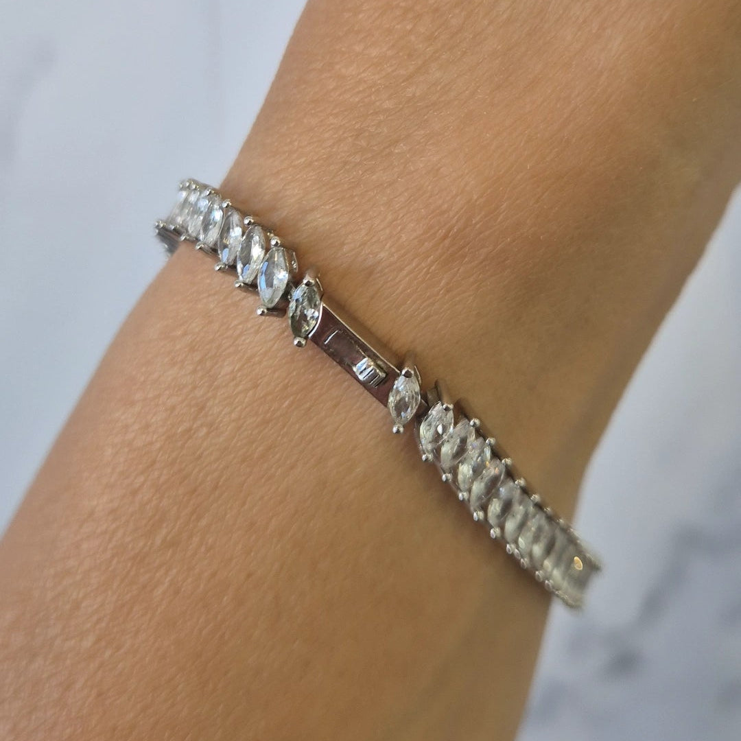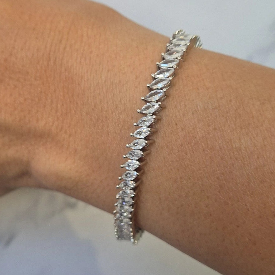 The Marquise Bracelet is a luxurious piece that combines classic elegance with modern design. Featuring a stunning series of marquise-shaped cubic zirconia stones, it catches and reflects light beautifully, offering a sparkle that complements a wide variety of outfits, from casual to formal.