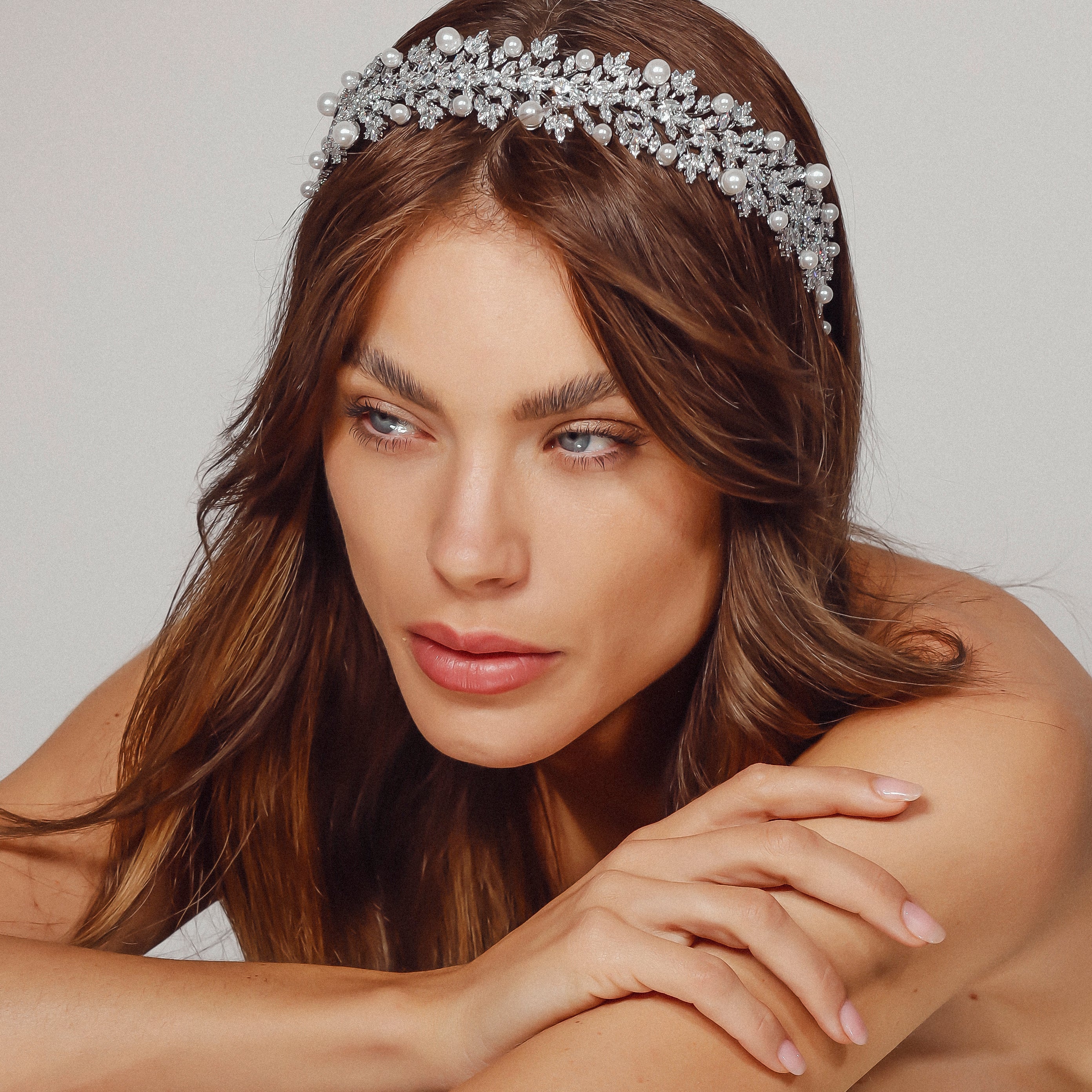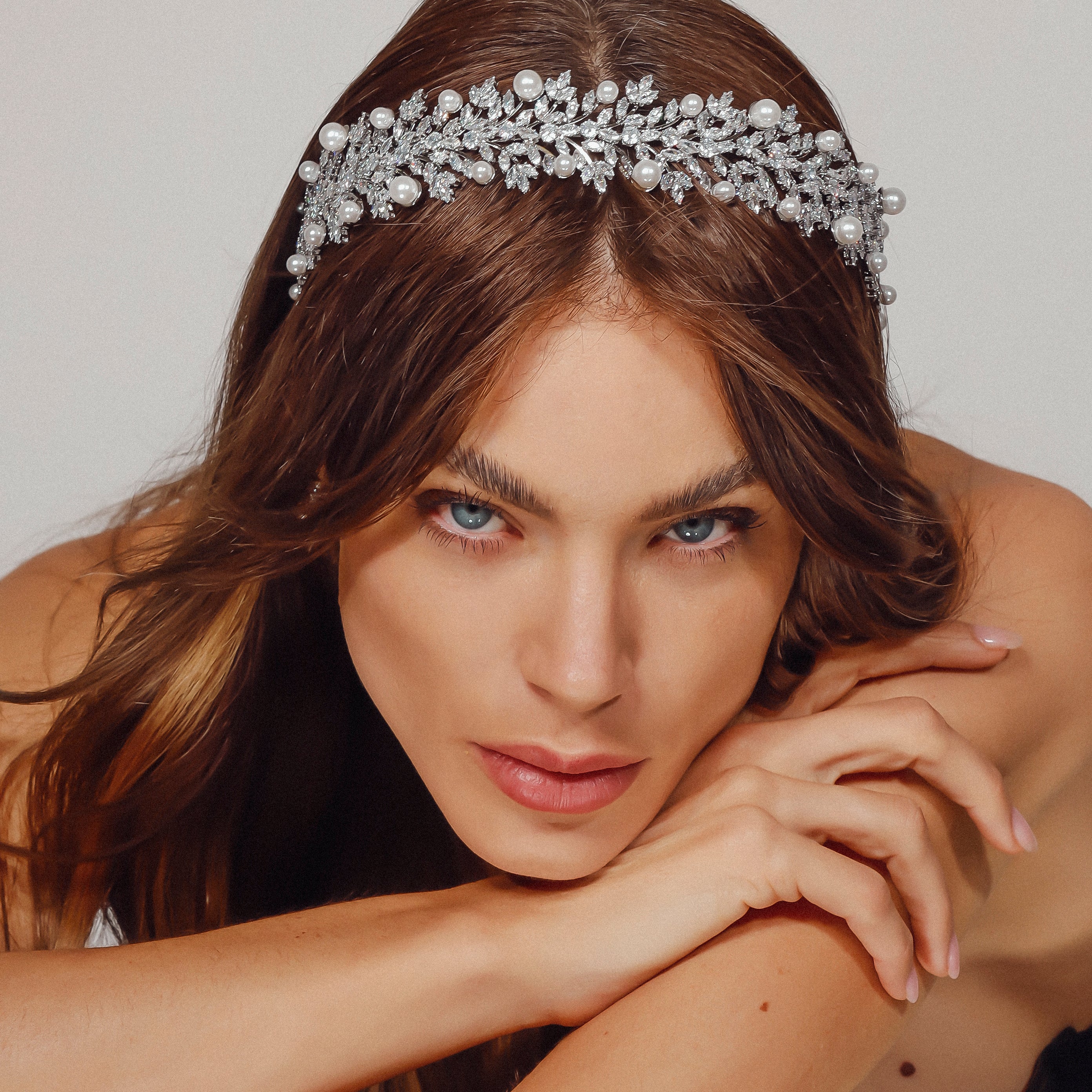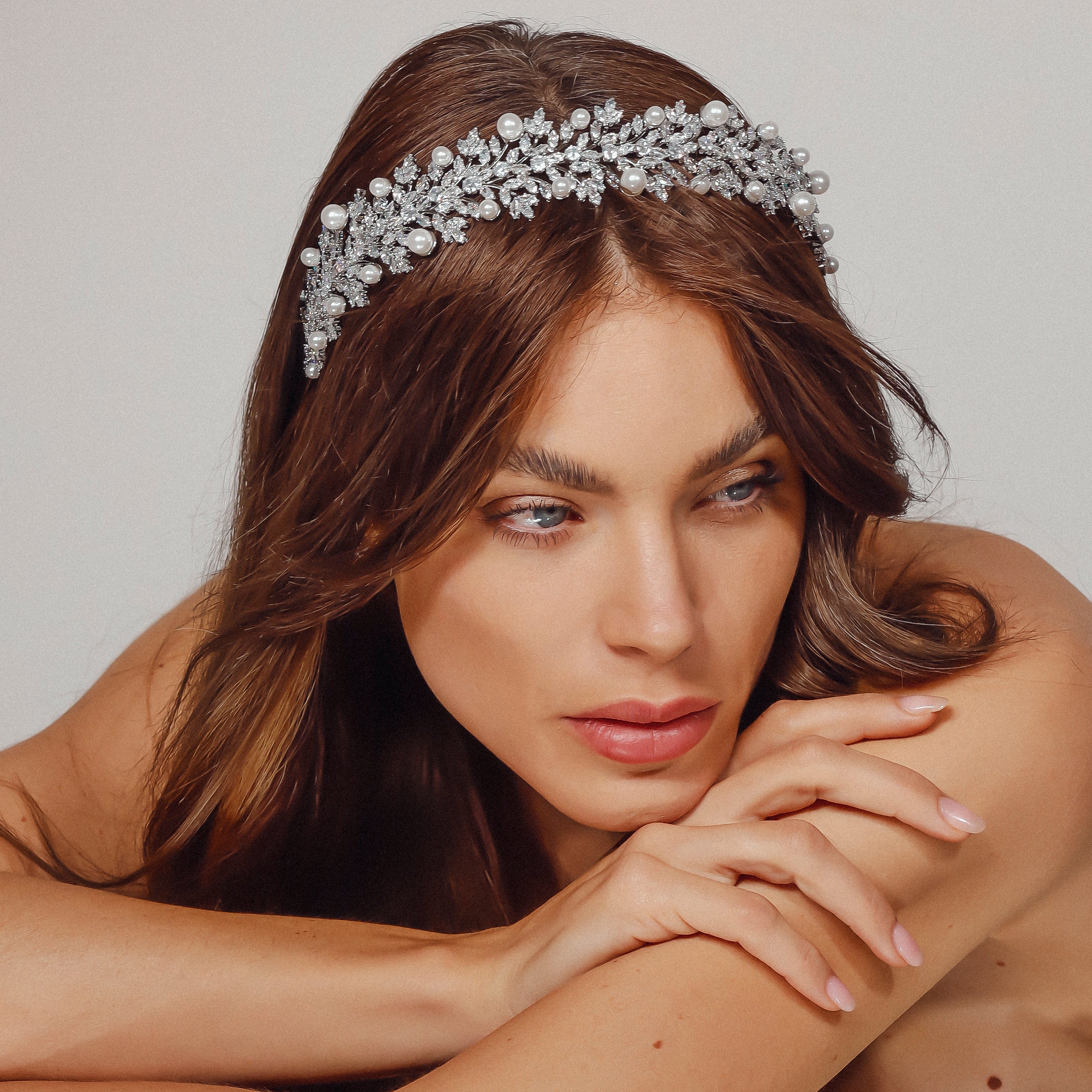 The Meerna Headpiece is a luxurious and captivating accessory, designed to add elegance to any ensemble. Crafted with Rhodium plating and adorned with AAA grade cubic zirconia and pearls, this headpiece radiates beauty and sophistication. Perfect for weddings, galas, or any special occasion, it will elevate your look with timeless charm and grace.