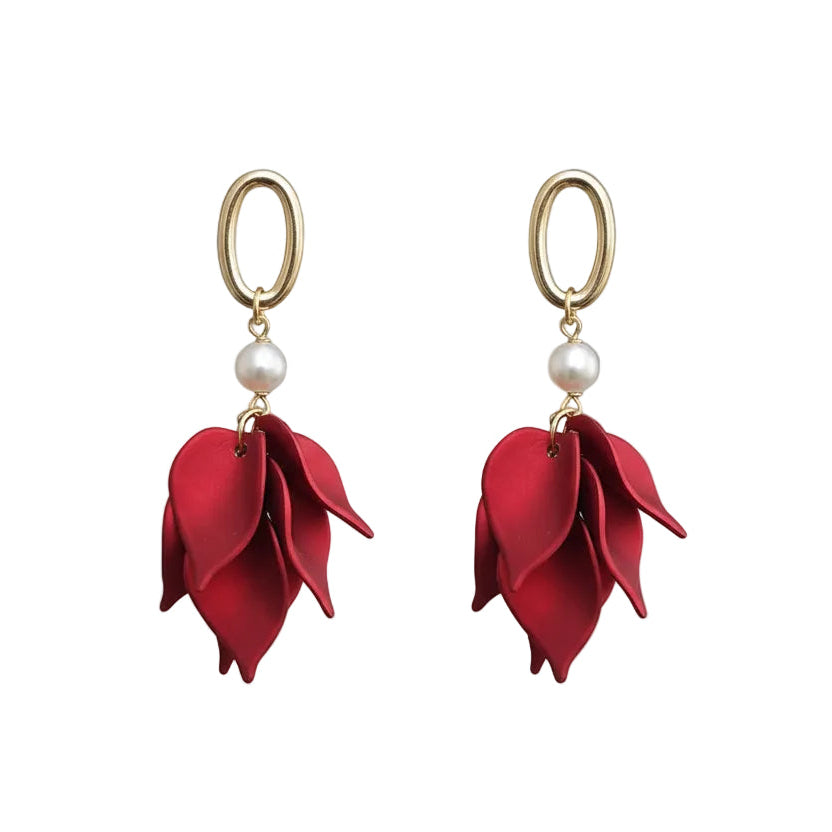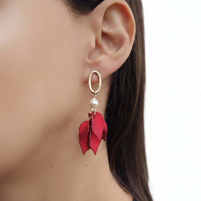 The Reem Earrings combine classic elegance with a playful twist. Featuring multiple red leaves hanging from an oval stud and pearl, these earrings are a true statement piece offering a refined and feminine look, making these earrings perfect for any special occasion or evening wear.