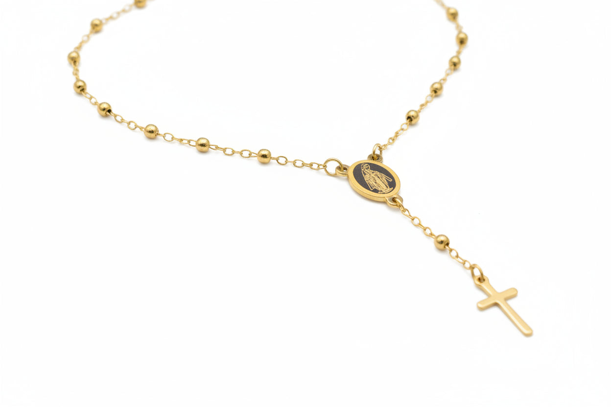 The Rene Bracelet is an elegant design featuring a detailed stainless steel Mother Mary pendant and cross, this piece serves as both a spiritual and a sophisticated accessory. Perfect for both daily use and special occasions.