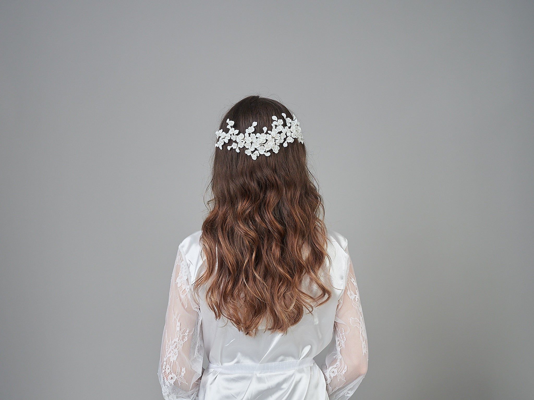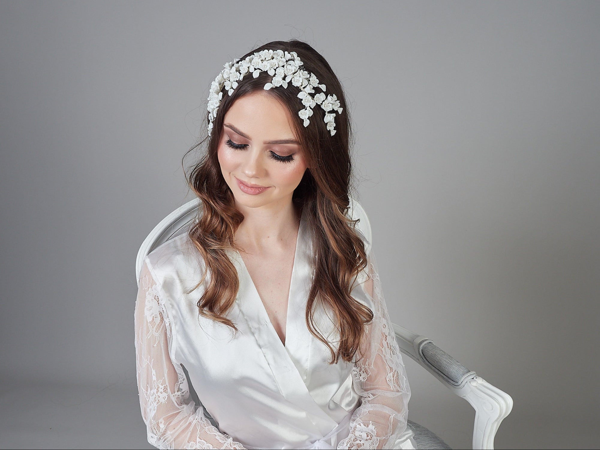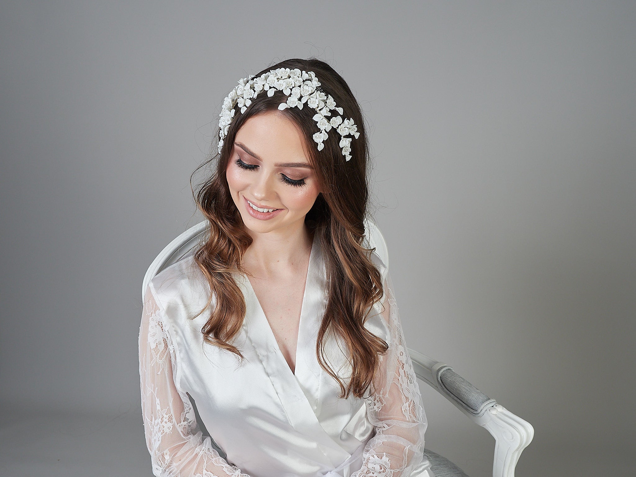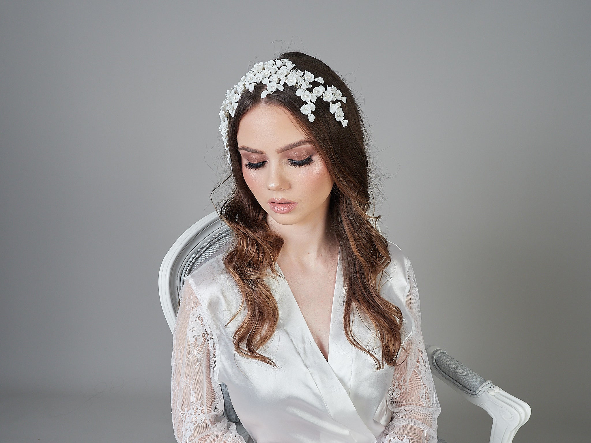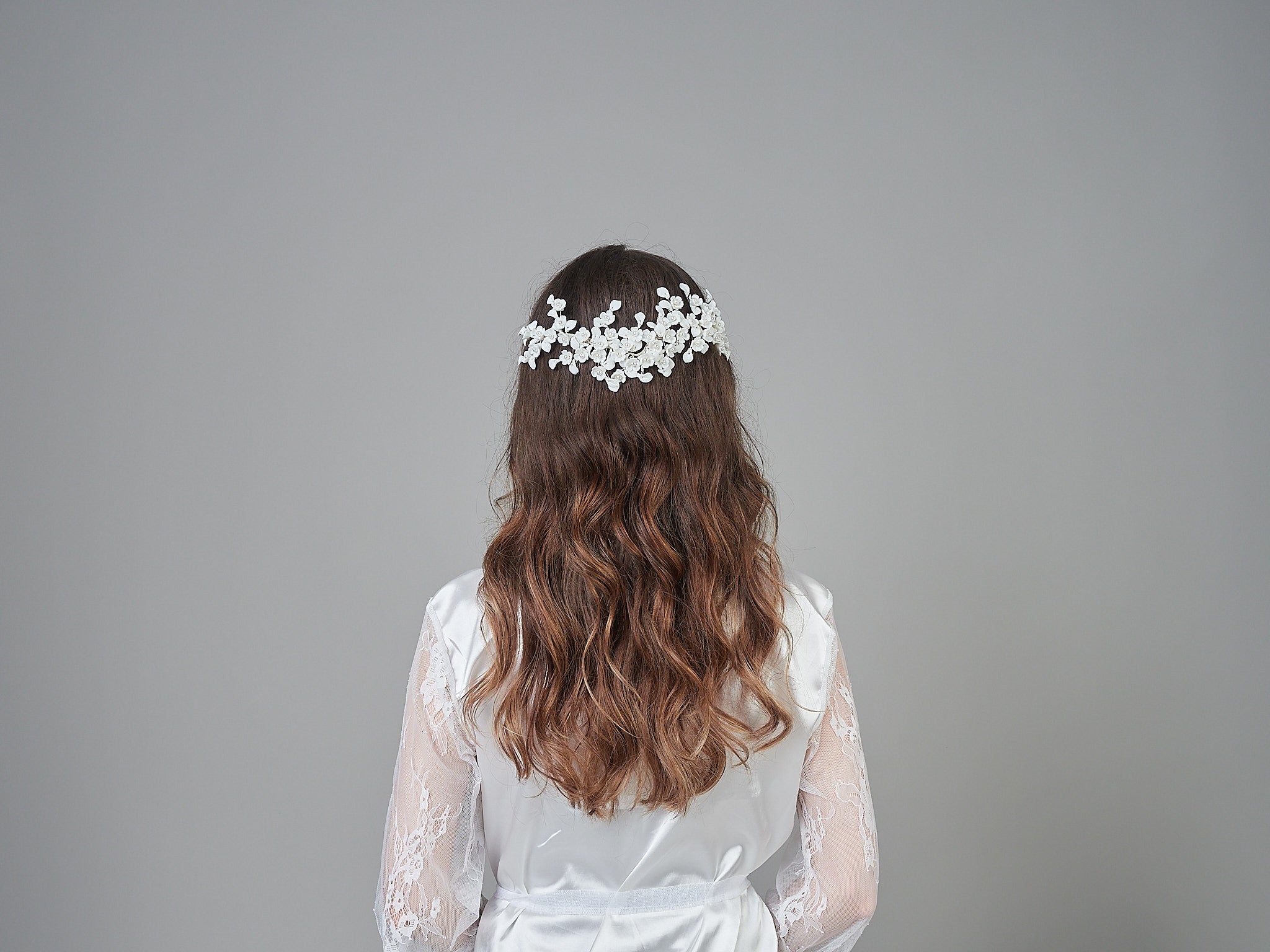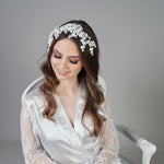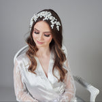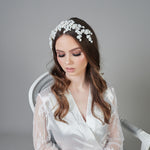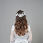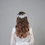 Introducing the Santiago Headpiece, a beautifully crafted piece with scattered flowers and pearls, making it a statement piece for any occasion.
