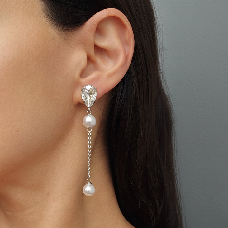 The Simmons Teardrop Earrings are a beautiful blend of elegance and sophistication featuring a sparkling teardrop crystal with lustrous pearls that elegantly sway with every movement. The simple yet striking design adds a refined touch to any ensemble, making them perfect for both casual and formal occasions.