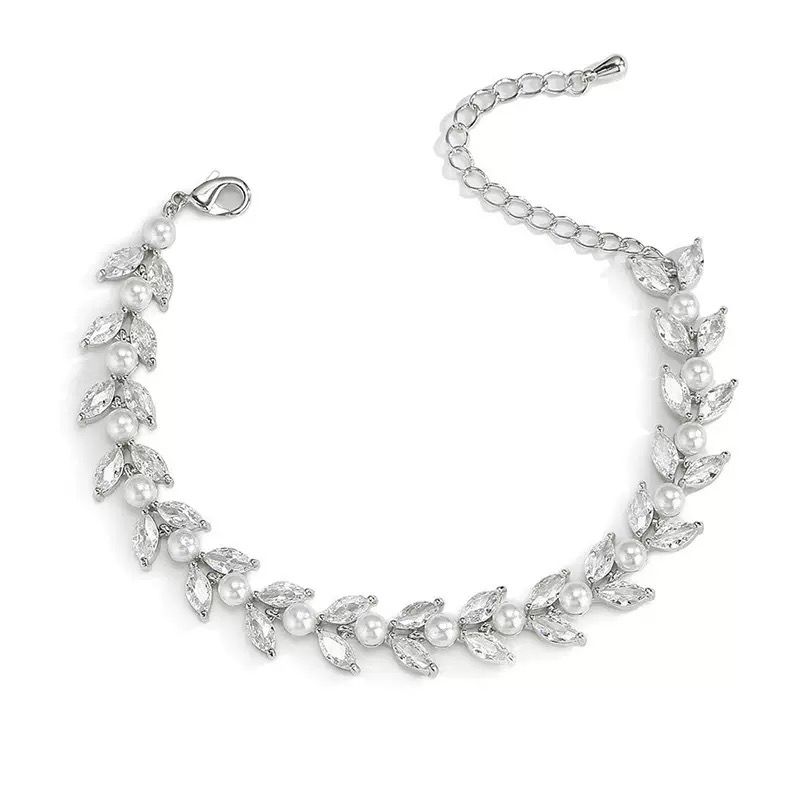 The Soule bracelet showcases a delicate design featuring exquisite crystal leaves interspersed with lustrous pearl beads. This enchanting piece is perfect for adding a touch of elegance and sophistication to any outfit, making it an ideal choice for both casual wear and special occasions.