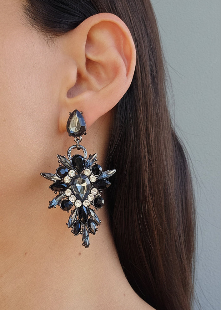 The Sparkle Hematite Earrings boast a stunning arrangement of dark gemstones, featuring a beautiful combination of black and grey hues, creating a striking visual effect.