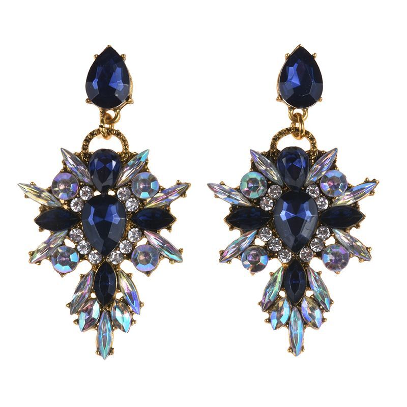 The Sparkle Navy Earrings boast a stunning arrangement of colorful gemstones, featuring a beautiful combination of turquoise and rose hues, creating a striking visual effect.