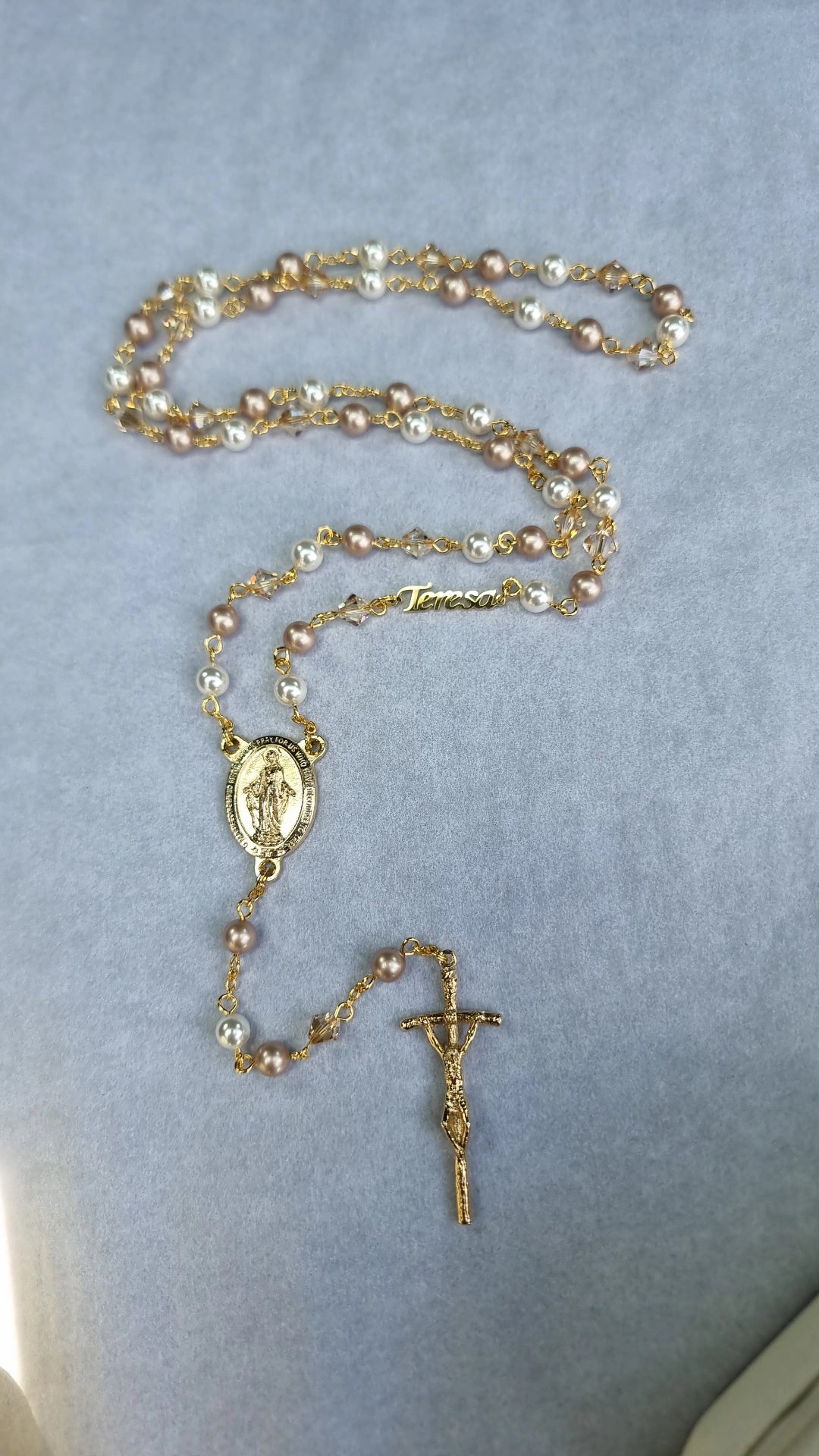 The Victoria Grace Rosary is a luxurious, spiritually meaningful piece crafted with care and elegance. This rosary is adorned with beautiful 6mm Swarovski/Preciosa crystals, pearls, that add a touch of refinement. The personalized option is available with name/memorial pendant or heart laser cut (as "Dad" and "Mum"), perfect for commemorating loved ones.