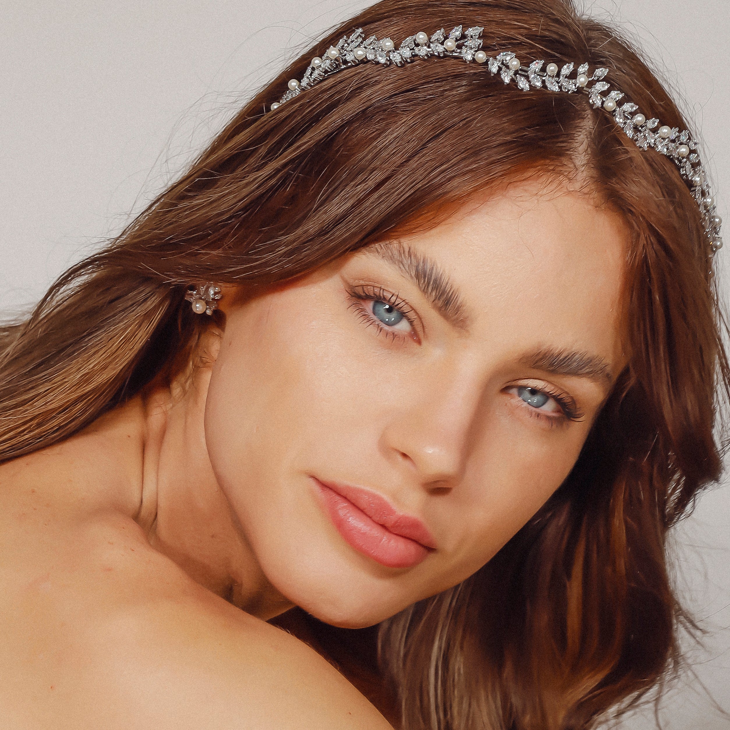 The Vincenza Headpiece exudes timeless elegance, crafted to perfection with Rhodium plating and adorned with AAA grade cubic zirconia and pearls. Its delicate design brings a touch of sophistication to any special occasion. Whether you're walking down the aisle, attending a formal event, or adding a glamorous touch to your hairstyle, this headpiece will captivate with its sparkling beauty.