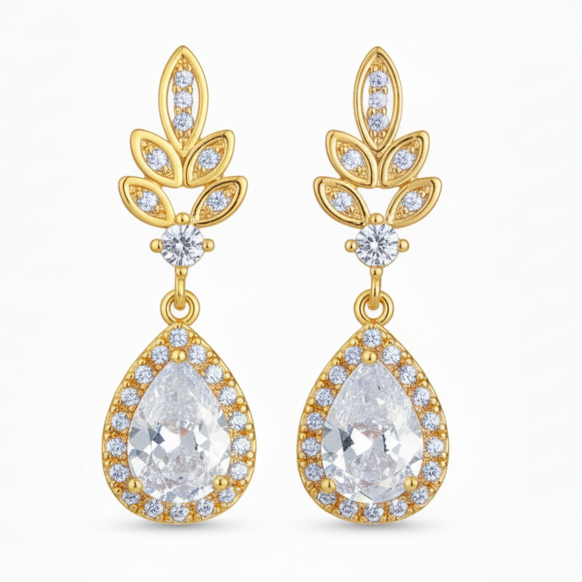 The Vula Earrings combine elegance and timeless beauty, designed to make any occasion extra special. The tear-drop shaped center stones are surrounded by smaller sparkling diamonds, offering a sophisticated and dazzling look. The delicate leaf-like details at the top add a touch of grace and luxury. Available in a stunning rhodium finish, these earrings are perfect for brides, special events, or a night out.