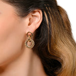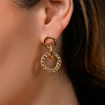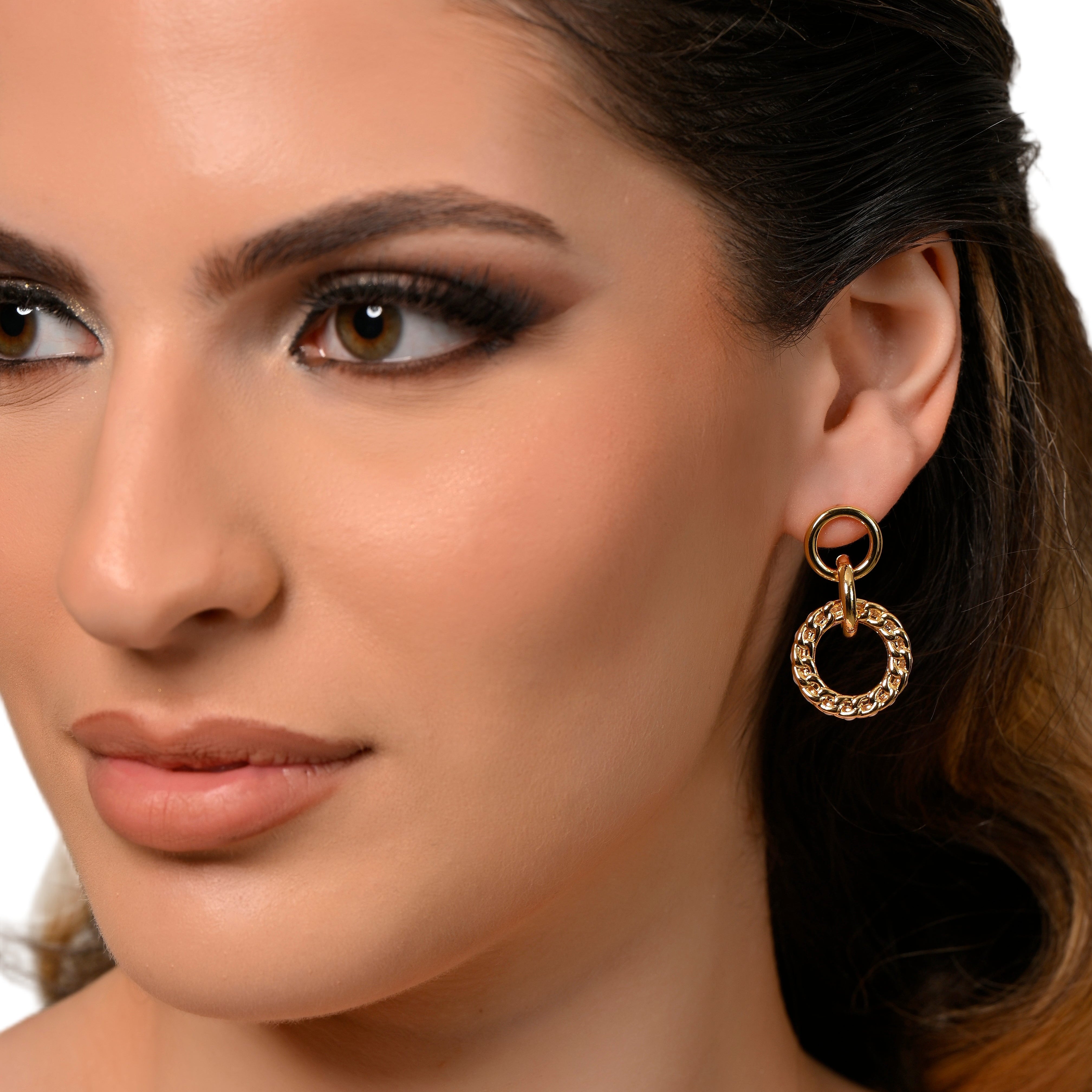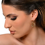 The Willow Earrings are the perfect blend of modern sophistication and timeless design. Featuring two interlinked round links with beautifully placed pearls all the way around, these earrings make a bold fashion statement. The sleek gold-tone finish adds a luxurious touch, ensuring that these earrings stand out in any setting. Their minimalist yet eye-catching design makes them perfect for both everyday wear and evening elegance.