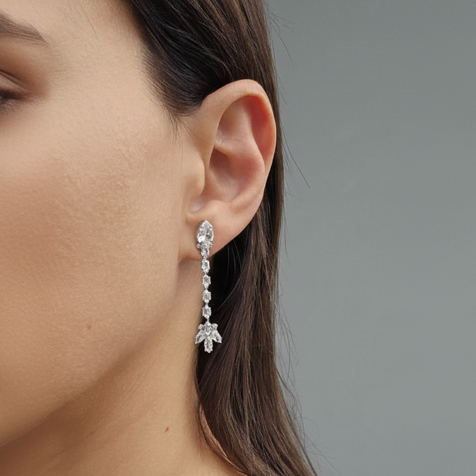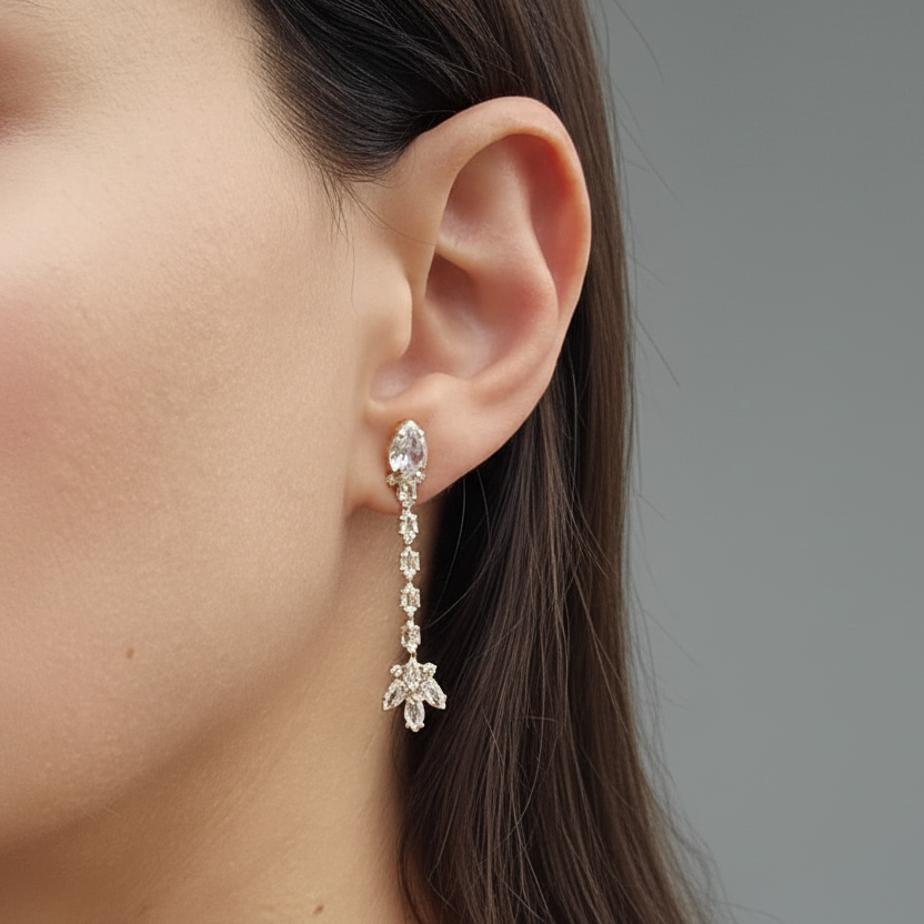 Introducing the Wynona Earrings, a stunning addition to any Jewellery collection. Featuring a cascade of sparkling cubic zirconia marquise, round and tear drop stones, these earrings are designed to capture light and attention, making them the perfect statement piece.