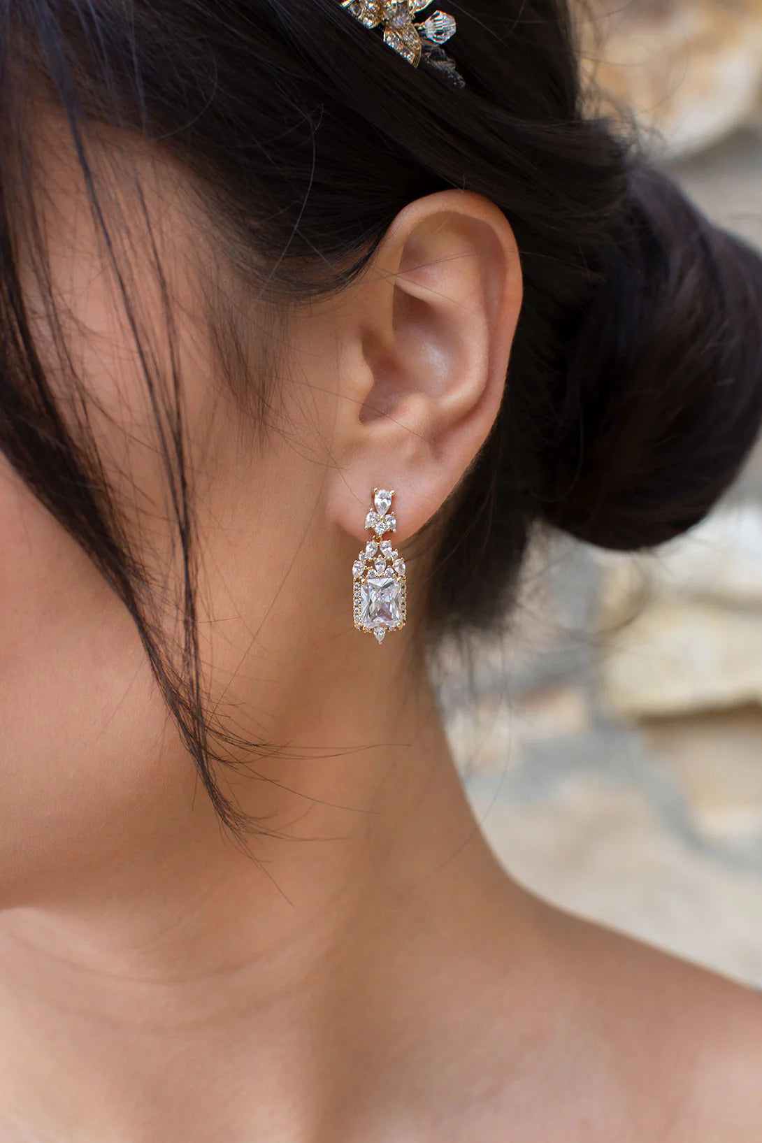 The Zeljka Earrings is a small yet striking statement drop earring, the centrepiece octagon stone gleams as it is bordered by an abundance of small zirconia crystal stones featuring a symmetrical and intricate design of small teardrop stones reaching up towards the post fitting. Let the beauty and elegance perfectly compliment your bridal outfit on your special day.